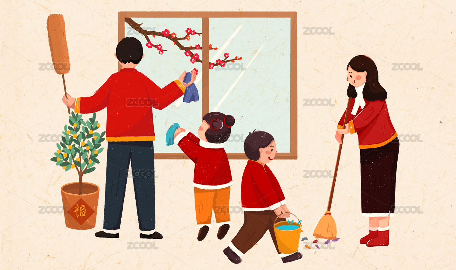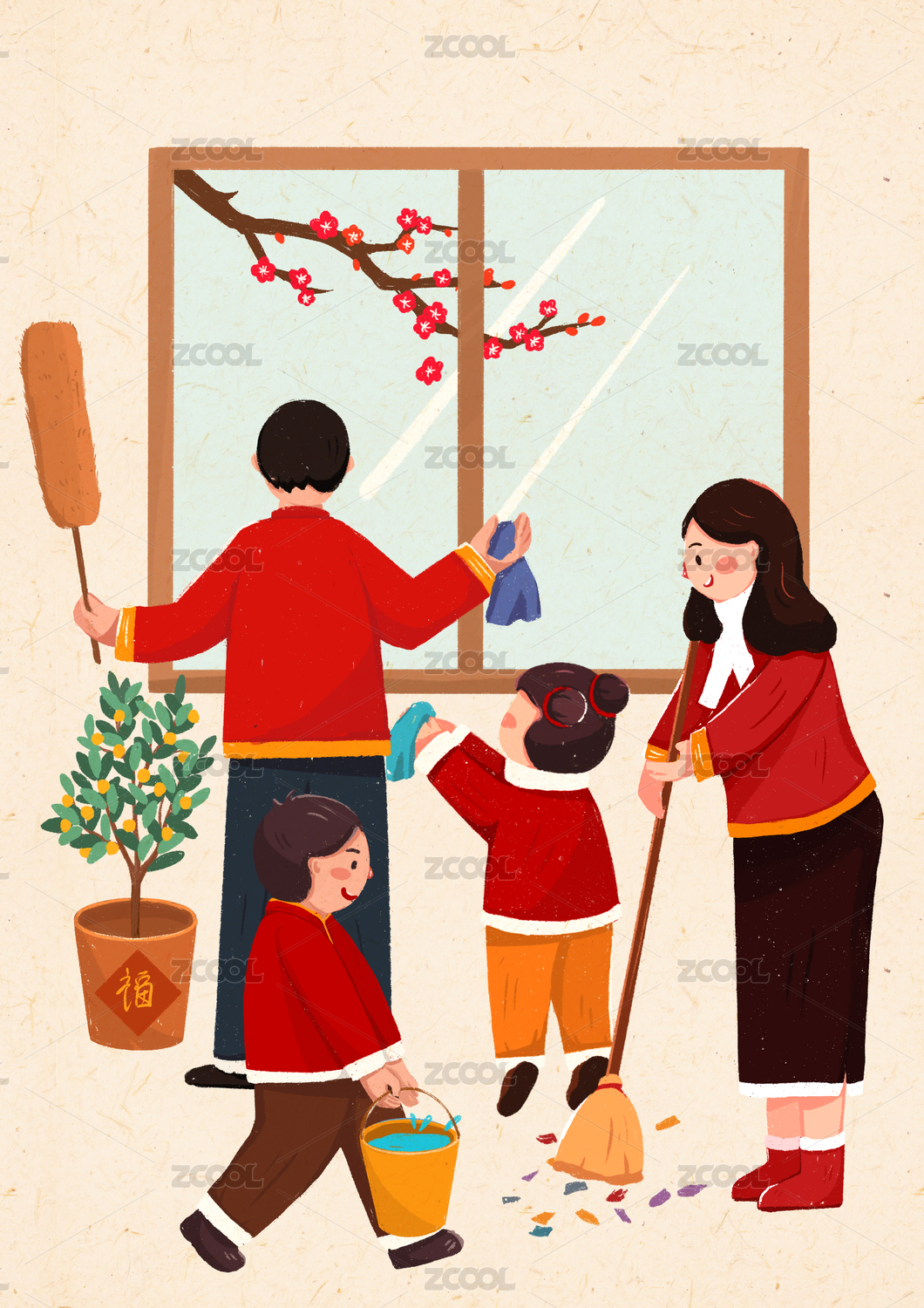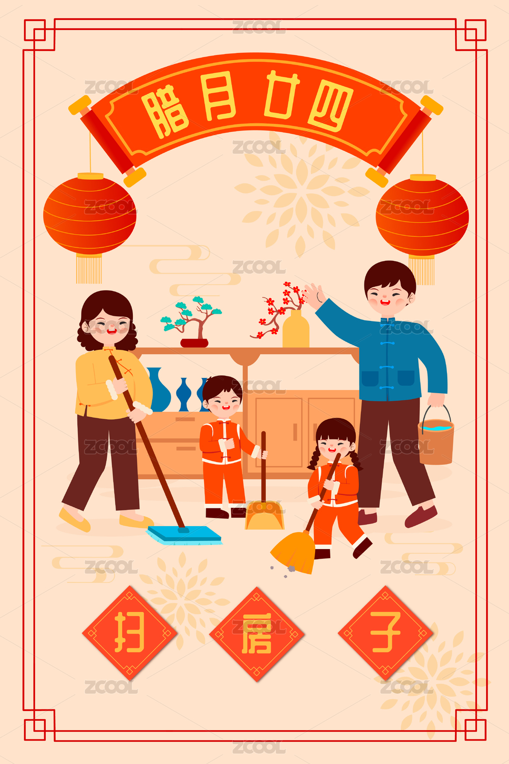 2019猪年新年春节过年年俗 腊月二十四 打扫卫生 插画