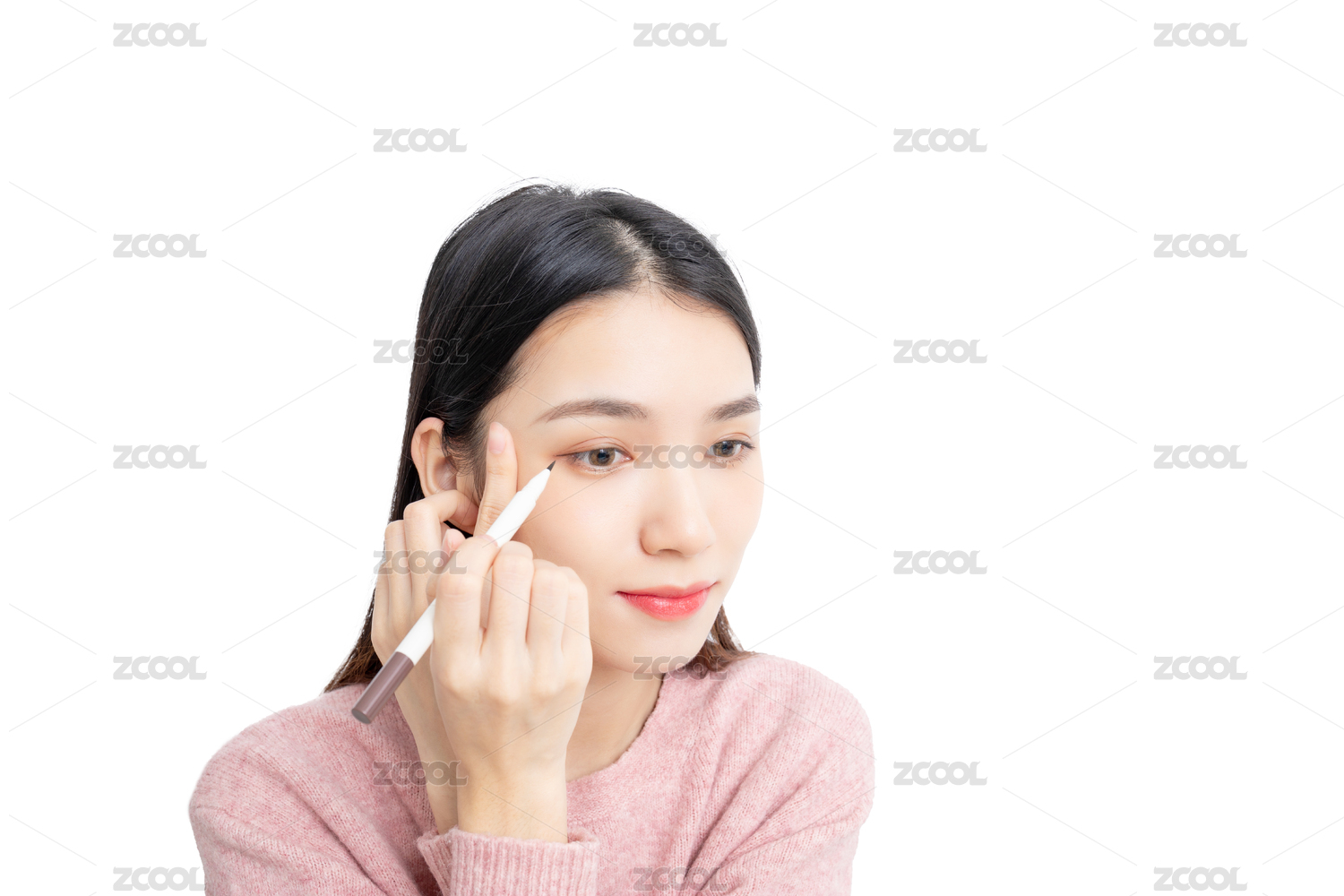 正在化妆的亚裔女孩站在纯色背景前手拿镜子和眼线笔
