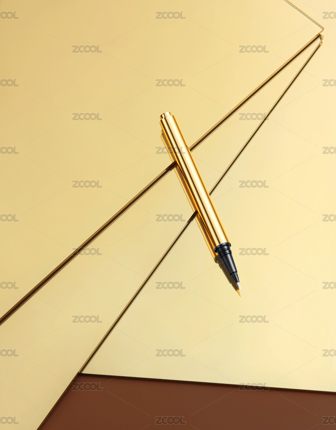 一名亚裔女孩站在纯色背景墙前手拿镜子和眼线笔化妆面带微笑