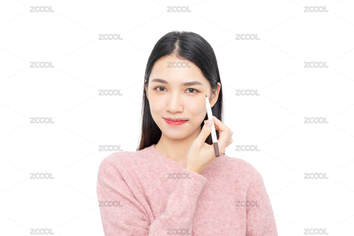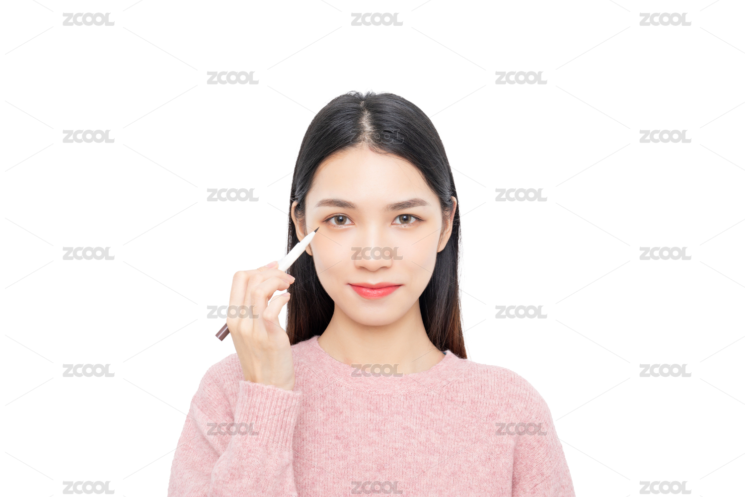 白背景中使用眼线笔的东方美女