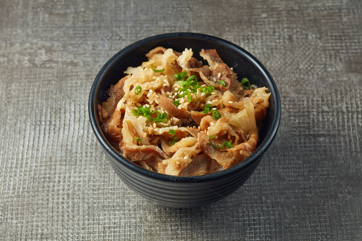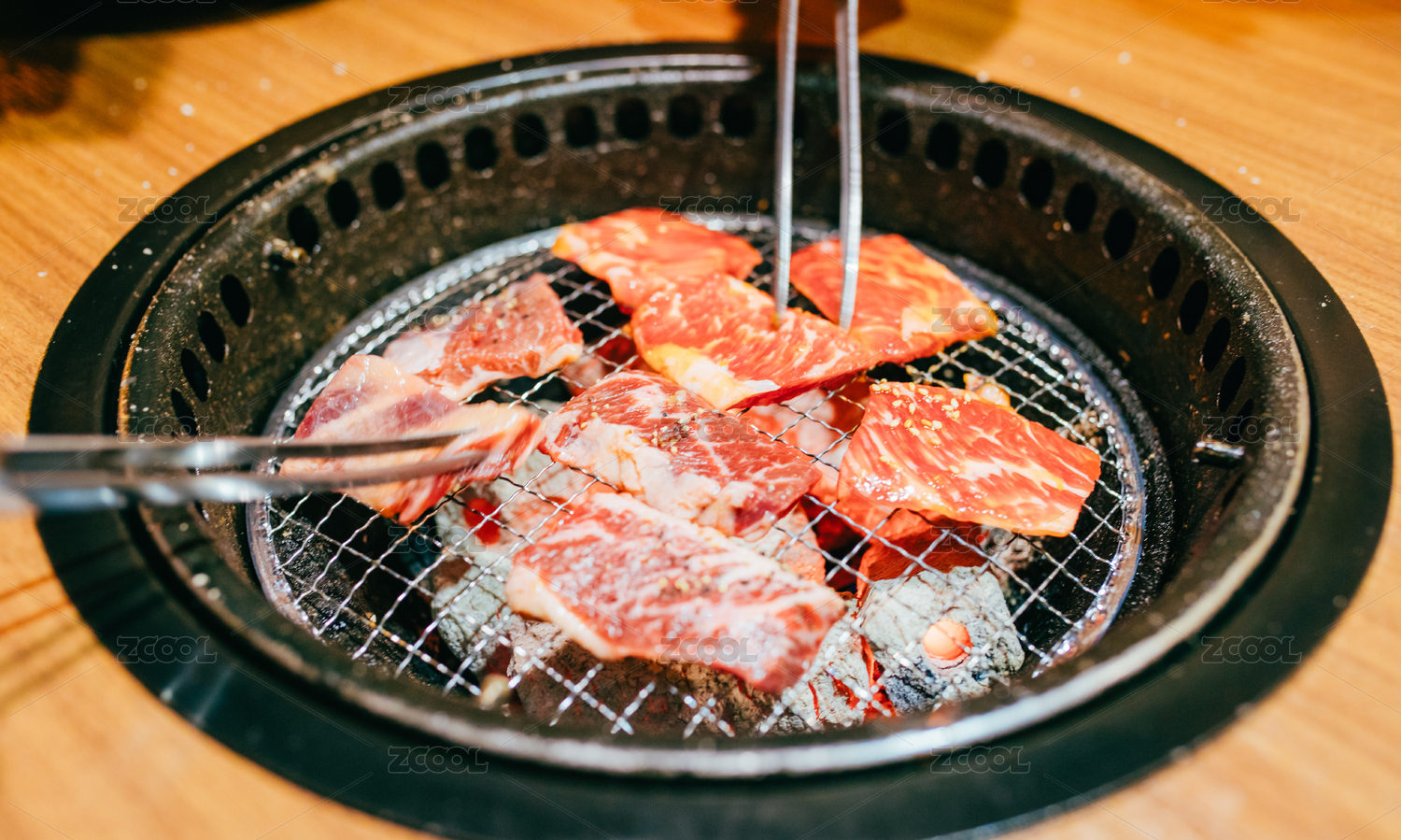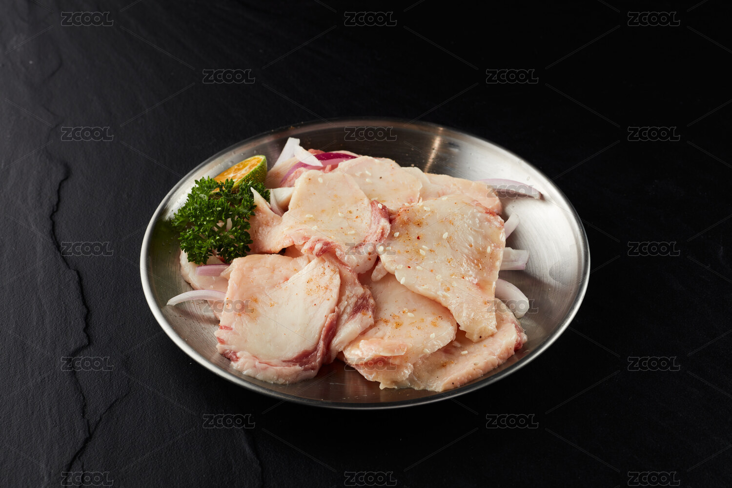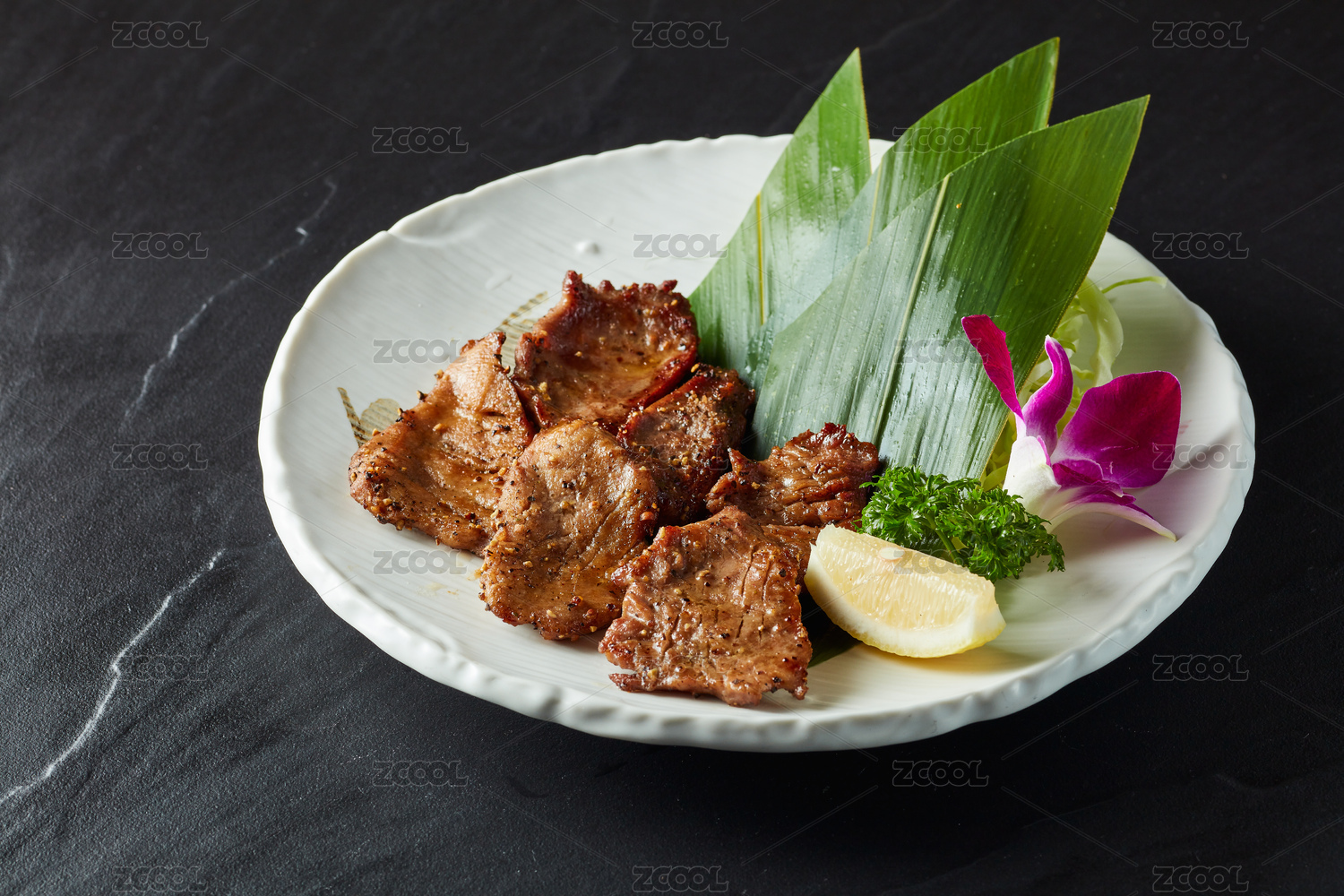 日式烧肉铁板上的美味葱盐烤牛舌特写
