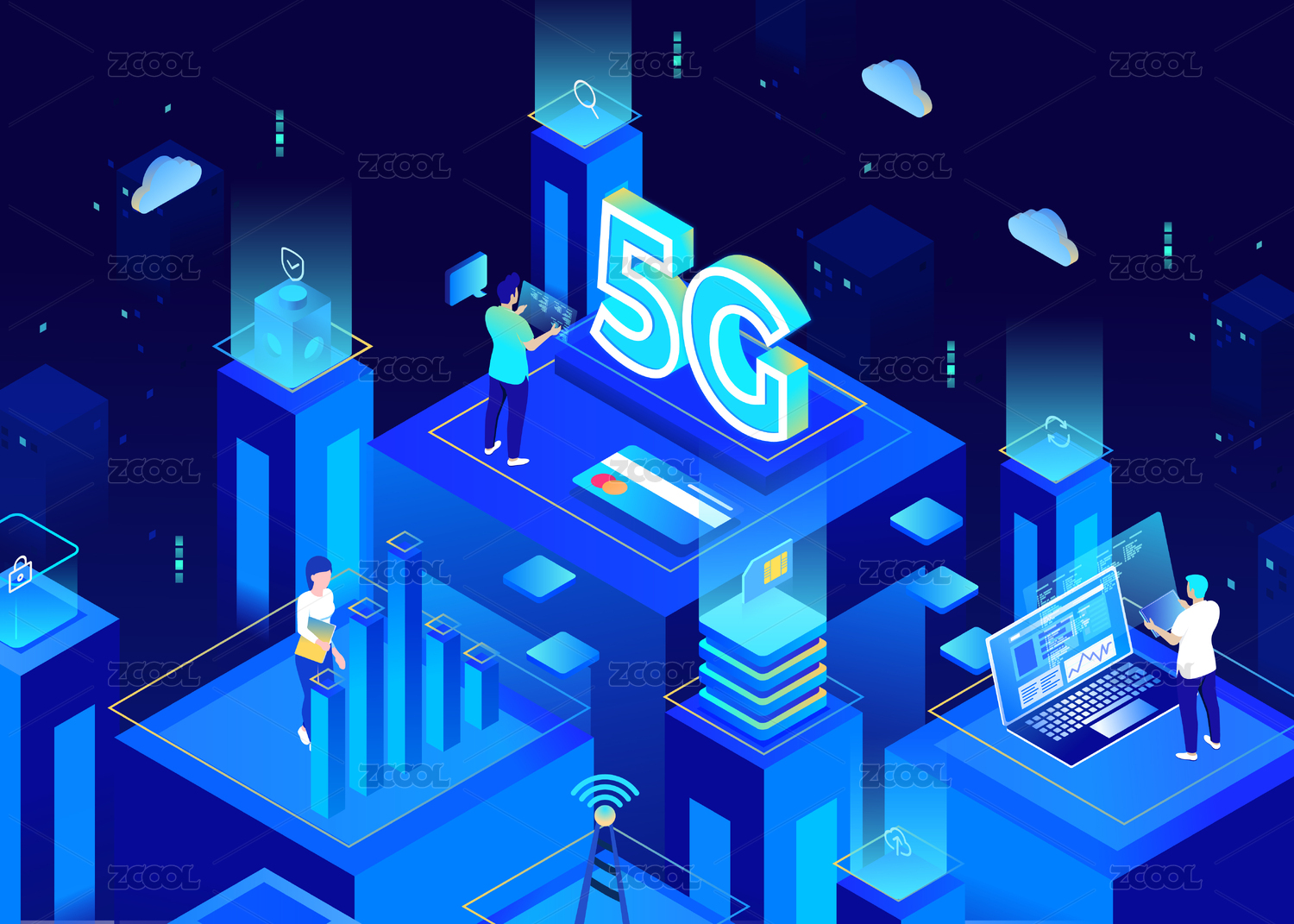 2.5D等距立体扁平5G互联网数据科技概念渐变矢量背景插画