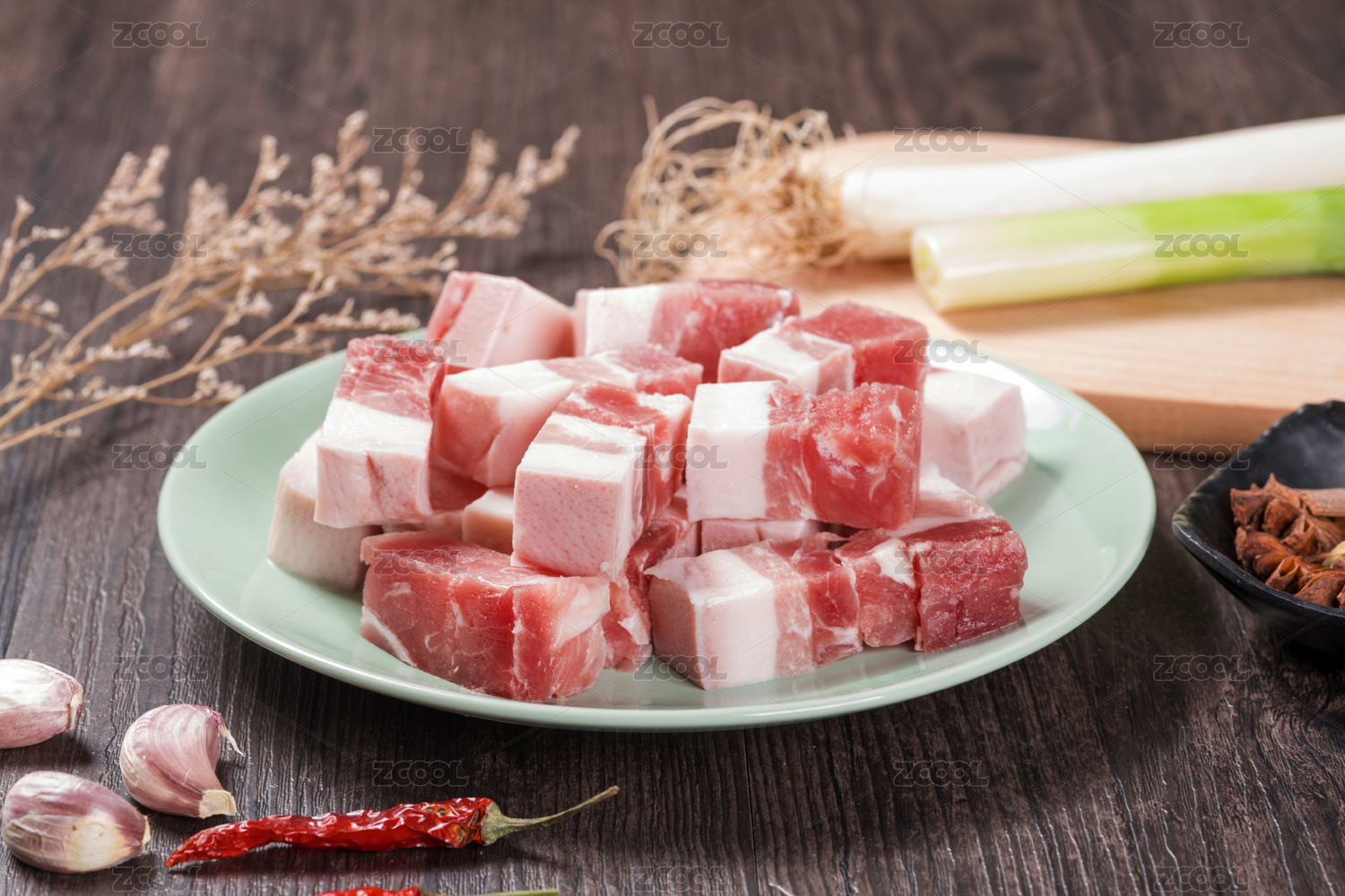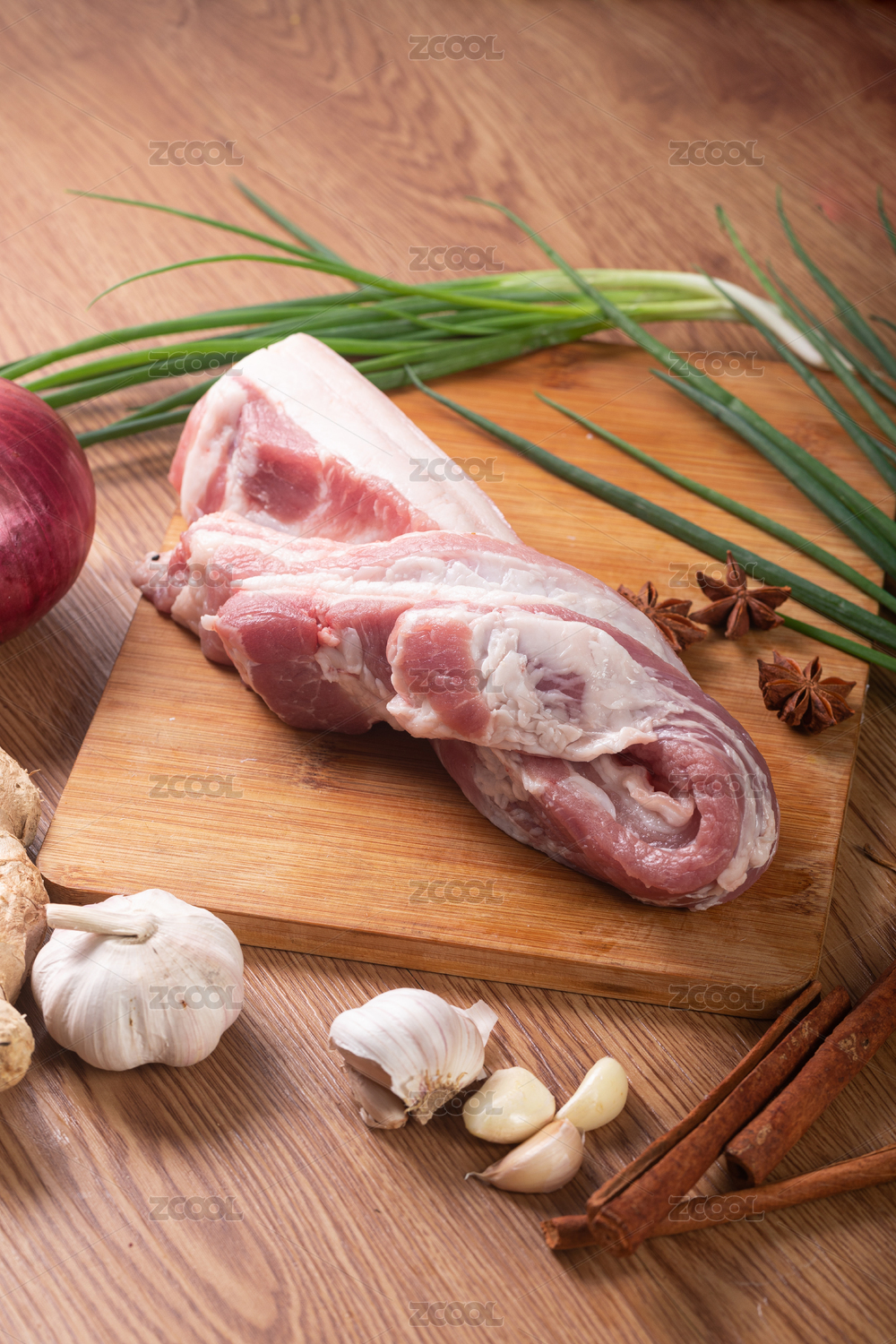 健康新鲜的猪五花肉和大葱