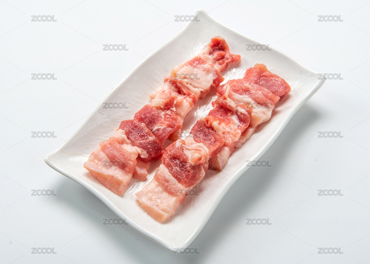 白色背景上餐盘中摆放的猪五花肉片