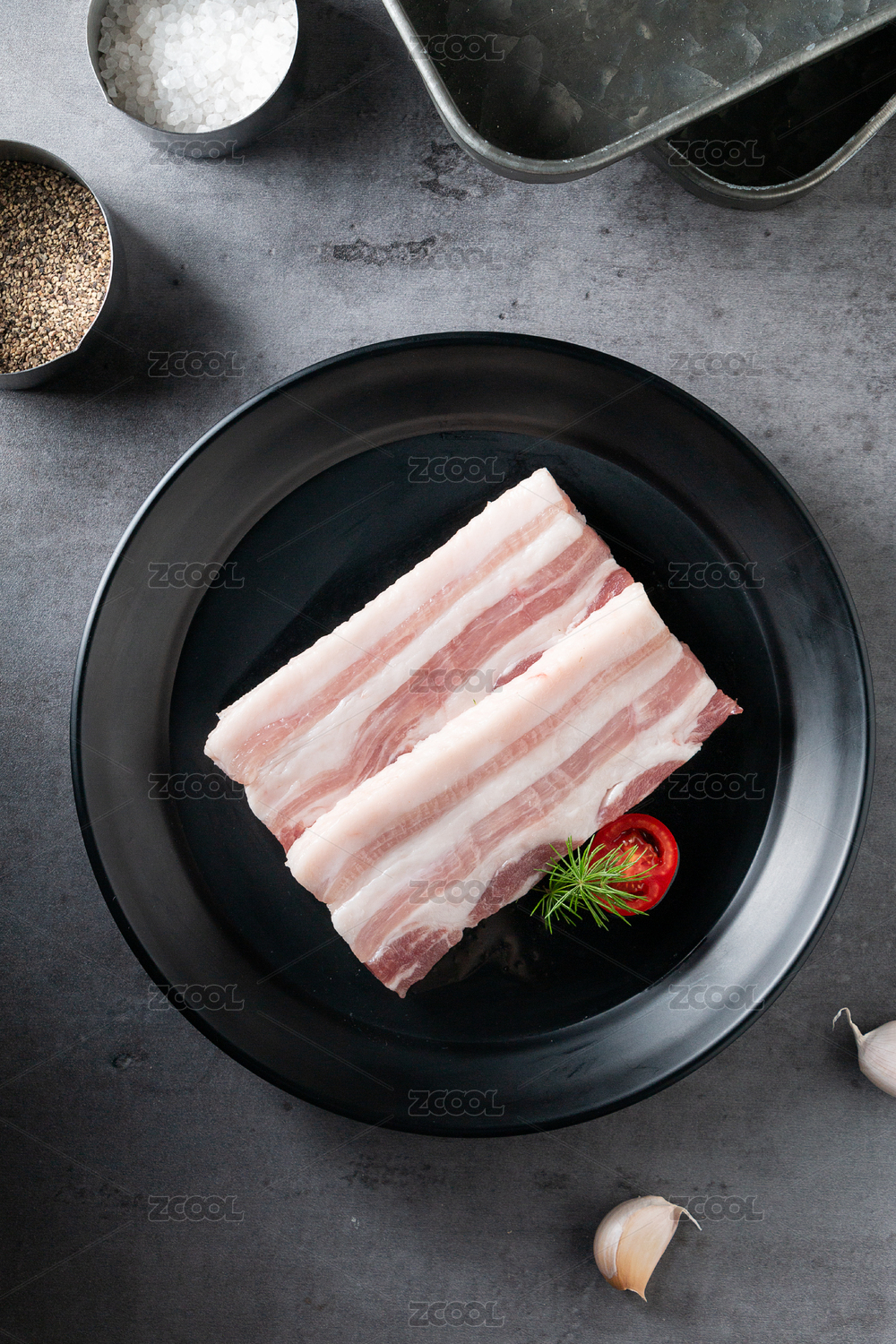 摆放在餐盘中新鲜的肥瘦相间的猪五花肉