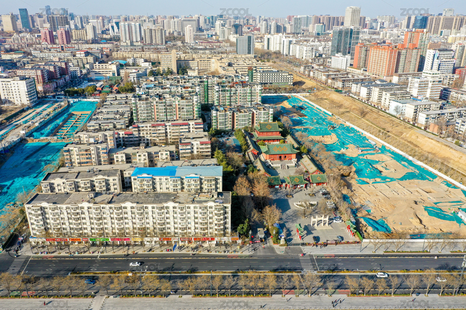 航拍中国郑州文庙及文物考古发掘工地探方