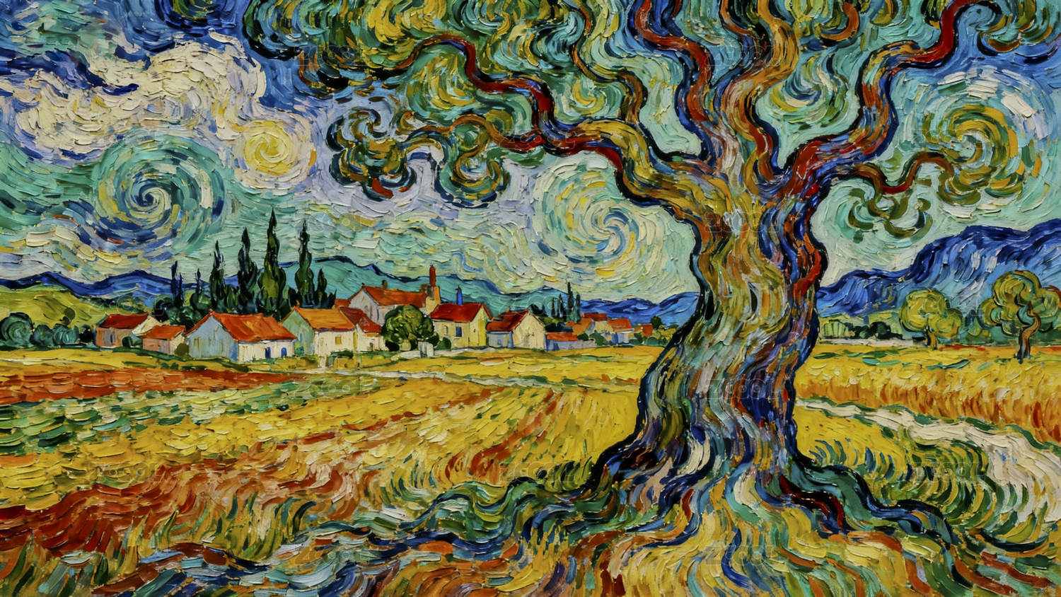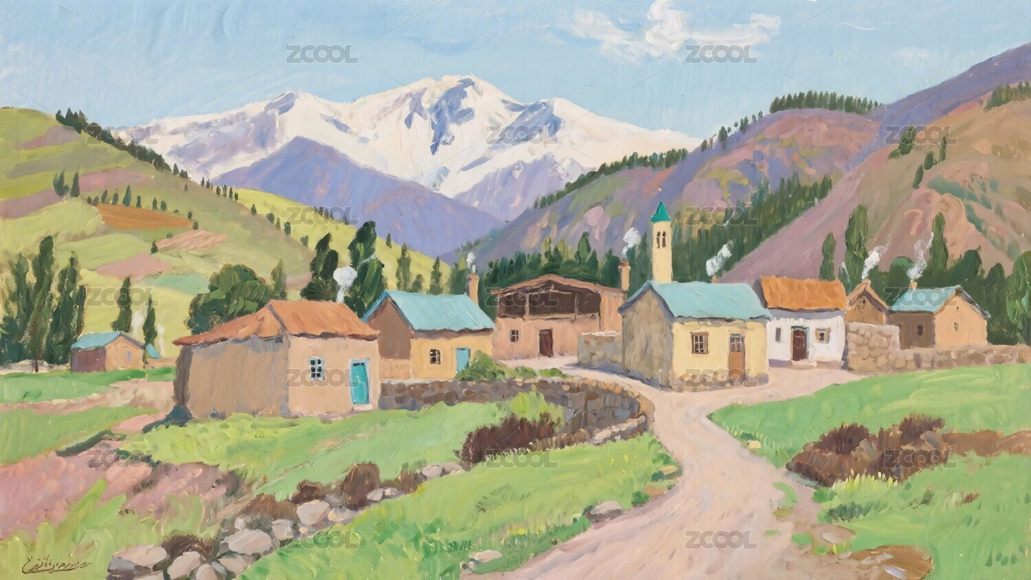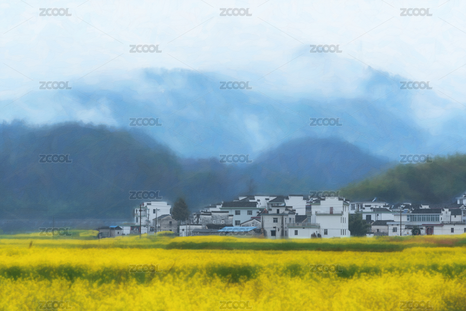 绿色田野村庄艺术感质抽象插画海报装饰画