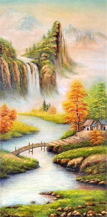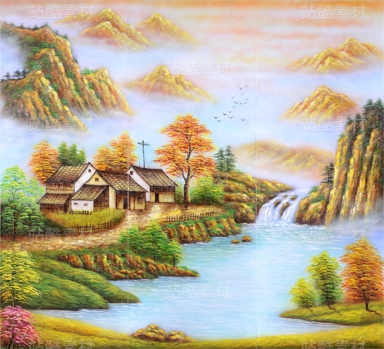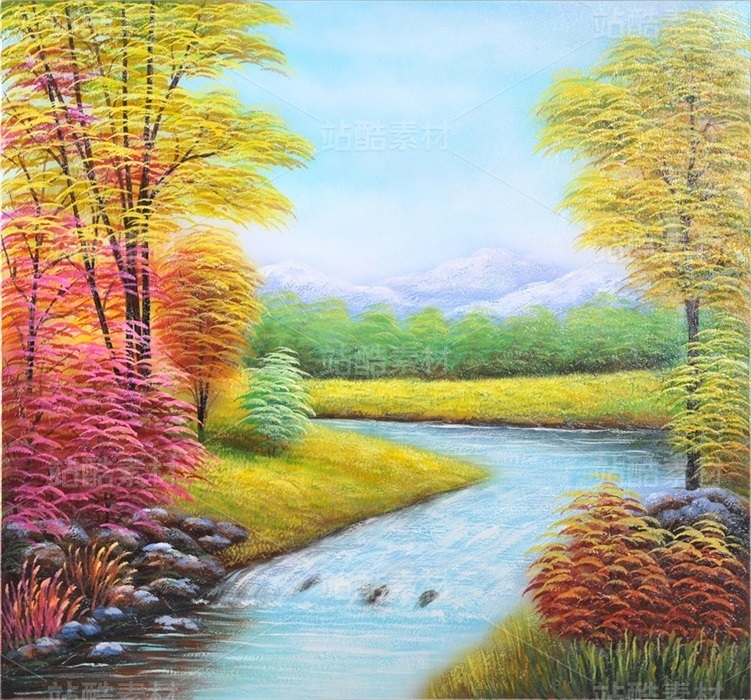 抽象笔触油画风秋日景色蓝天白云麦穗雪山