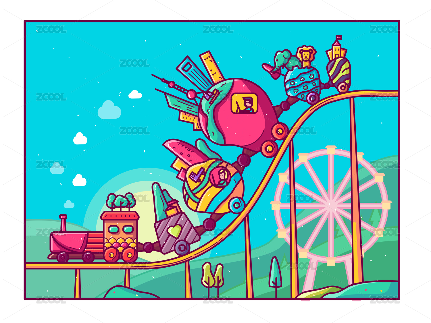 移动的小火车将学校游乐场家庭父母都连在了一起孩子可以无忧无虑快乐游玩矢量插画