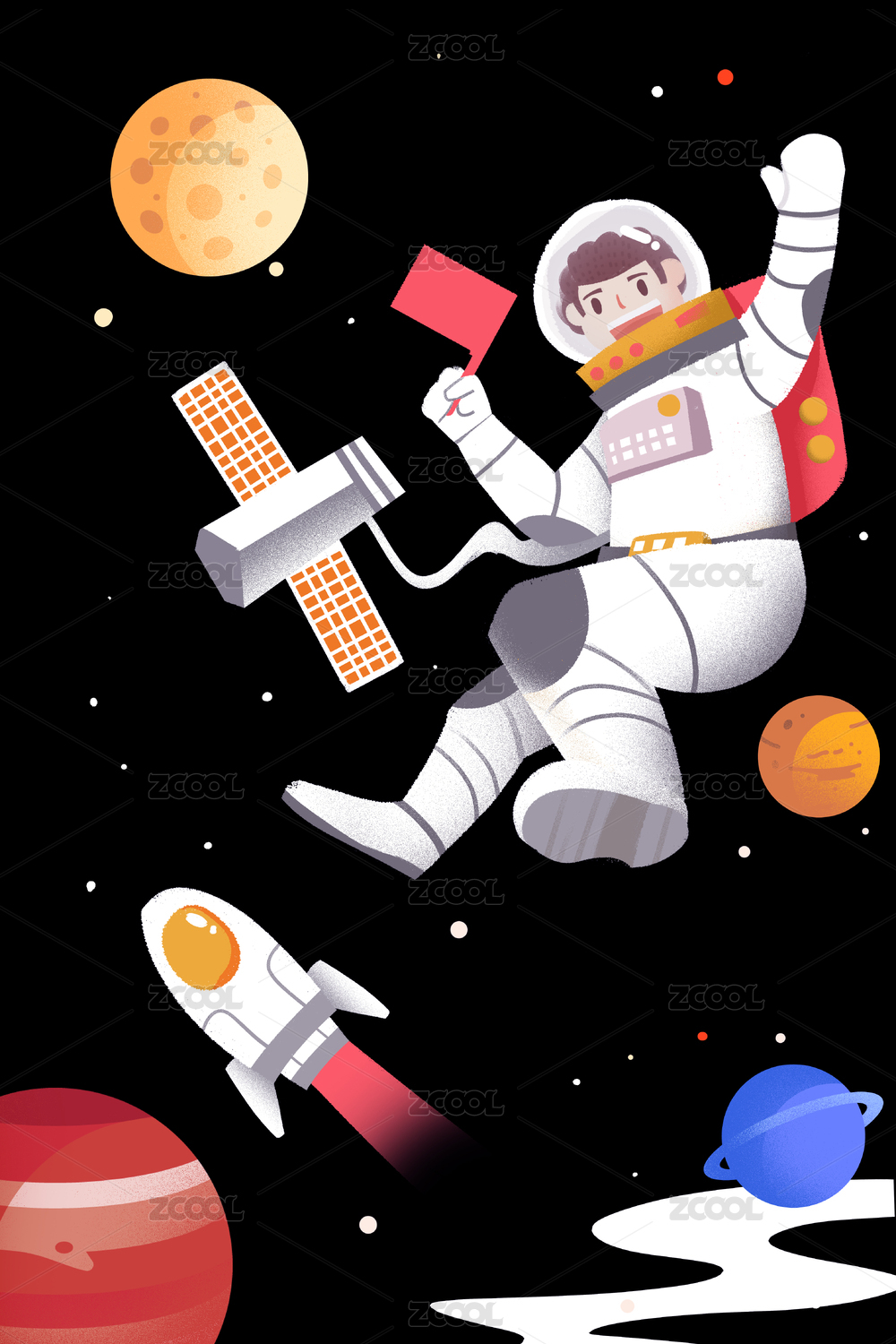 卡通手绘中国航天日宇航员太空星空工作插画