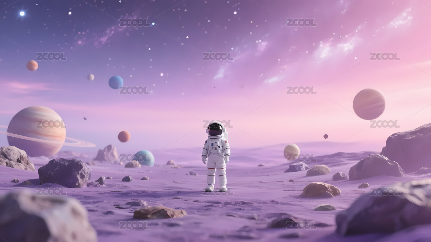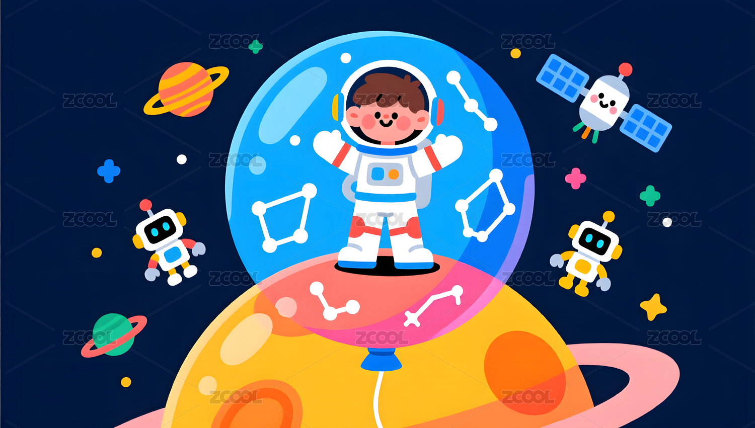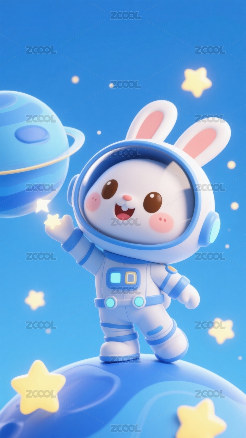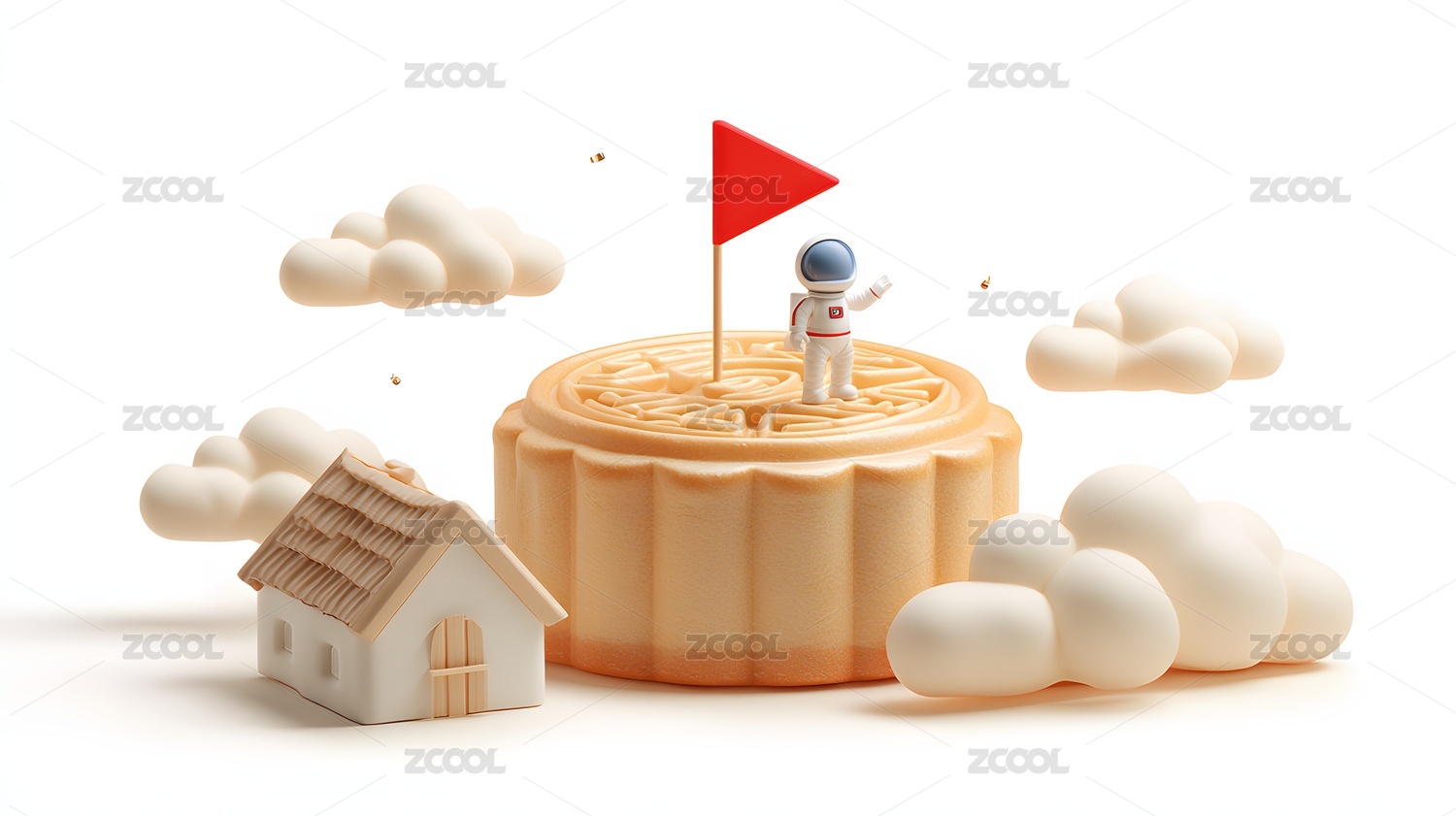 卡通宇航员站在月饼小房子红旗云朵3D插画