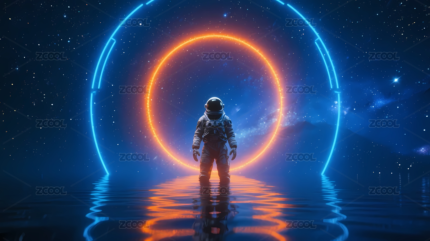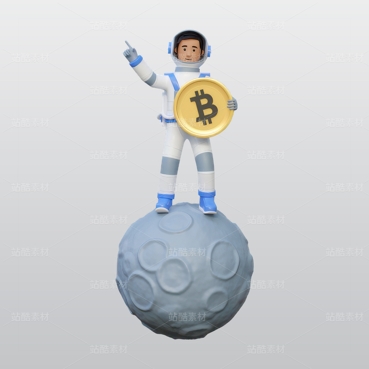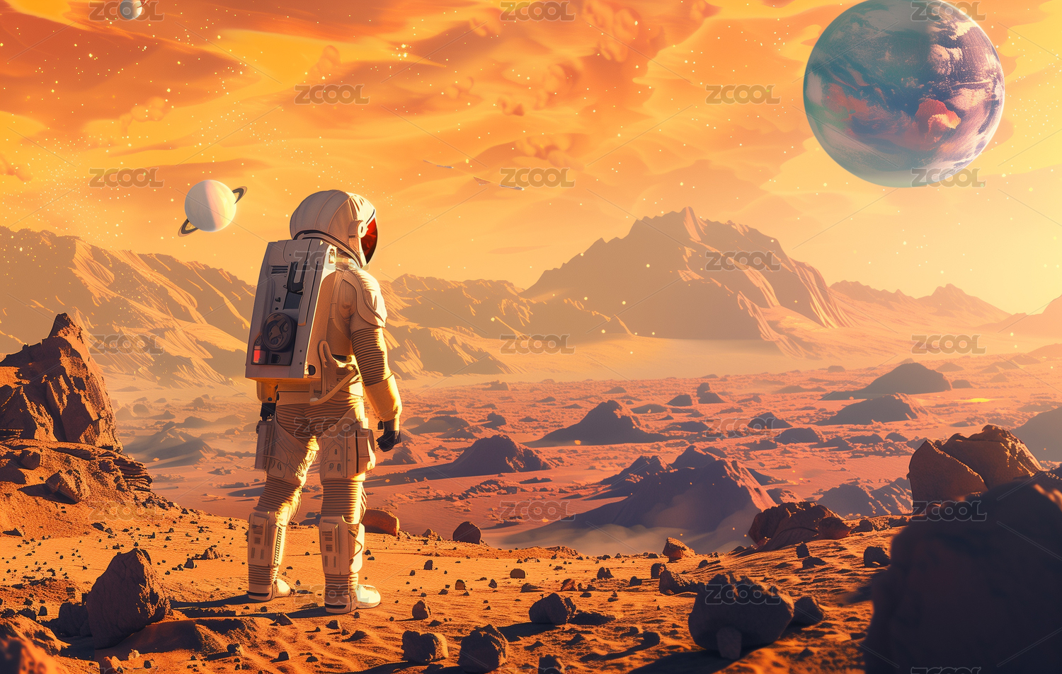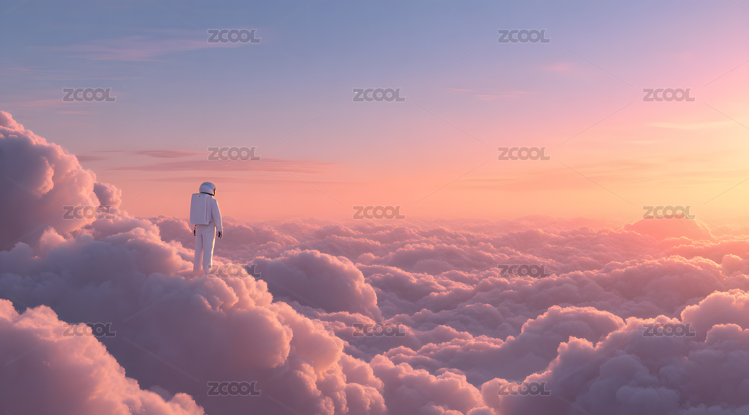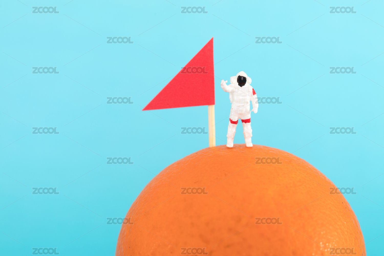 卡通宇航员站在月饼小房子红旗云朵3D插画