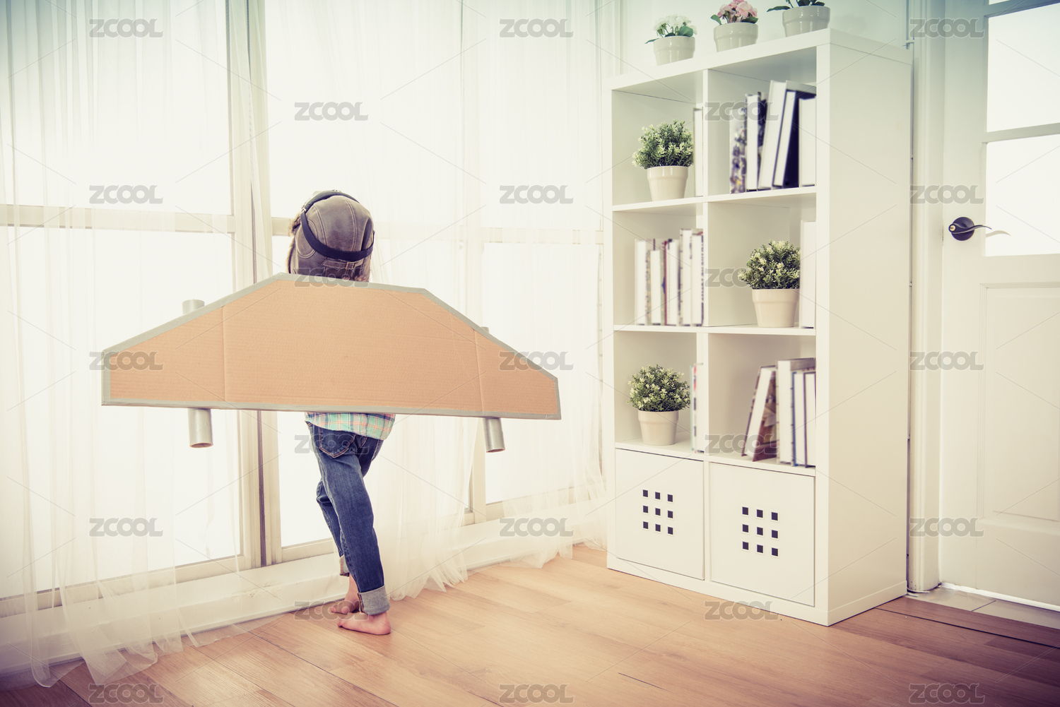 幸福可爱的小女生穿着小子飞翼扮演宇航员站在客厅的木地板上看着镜头微笑。