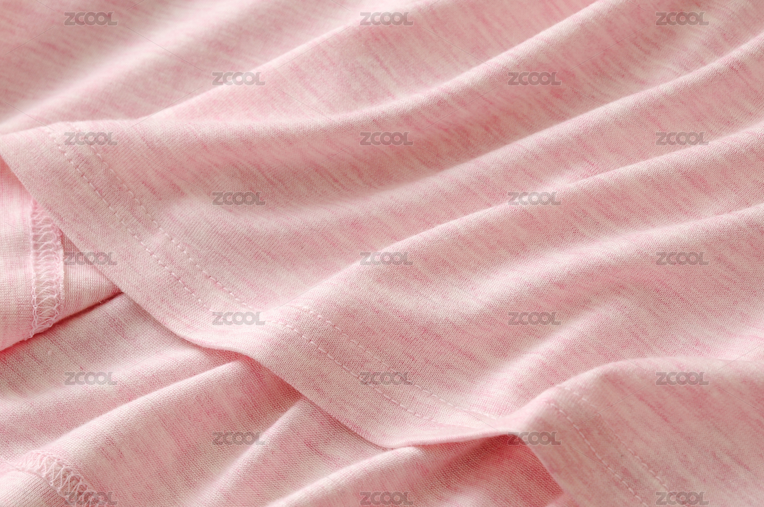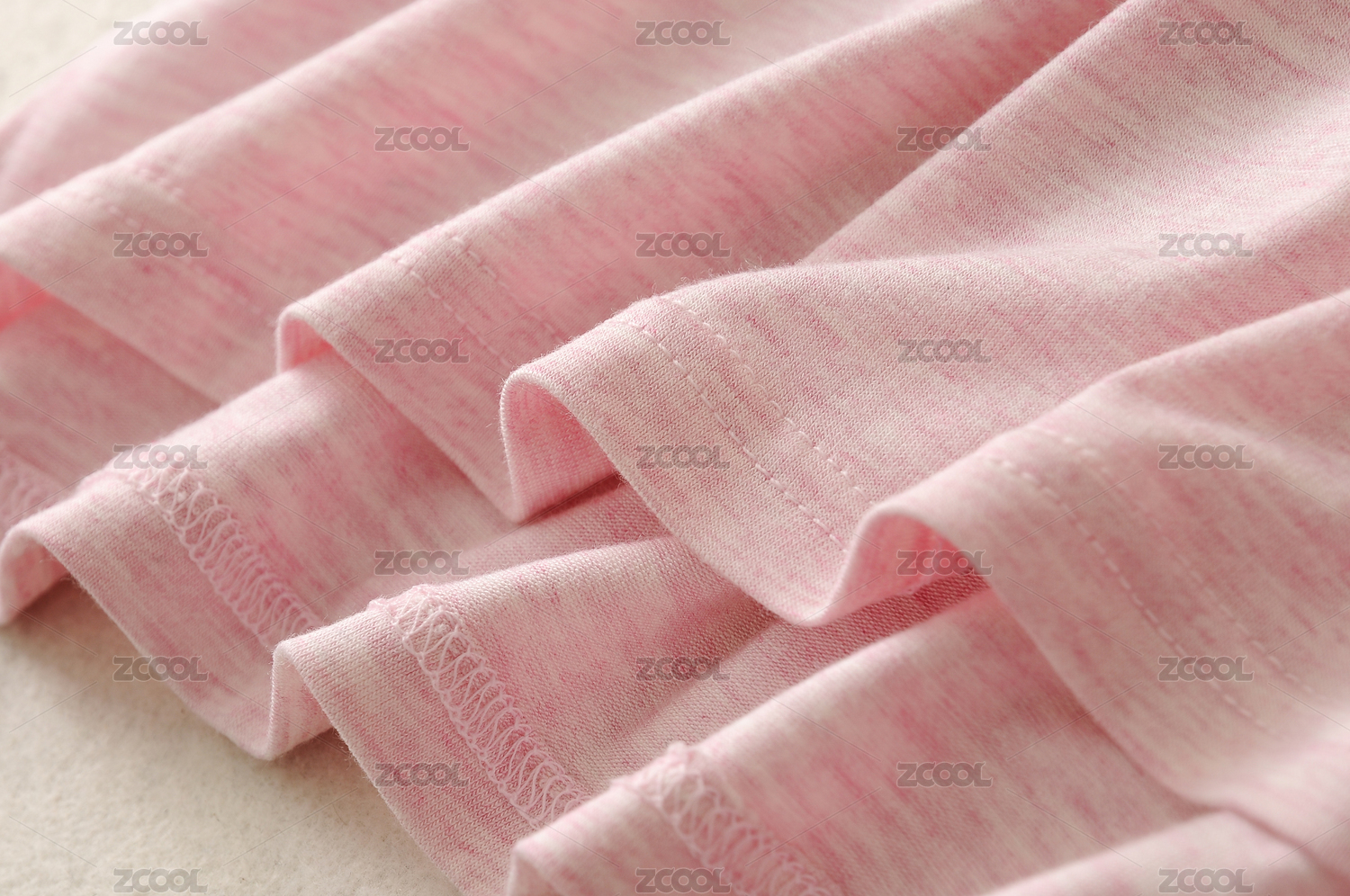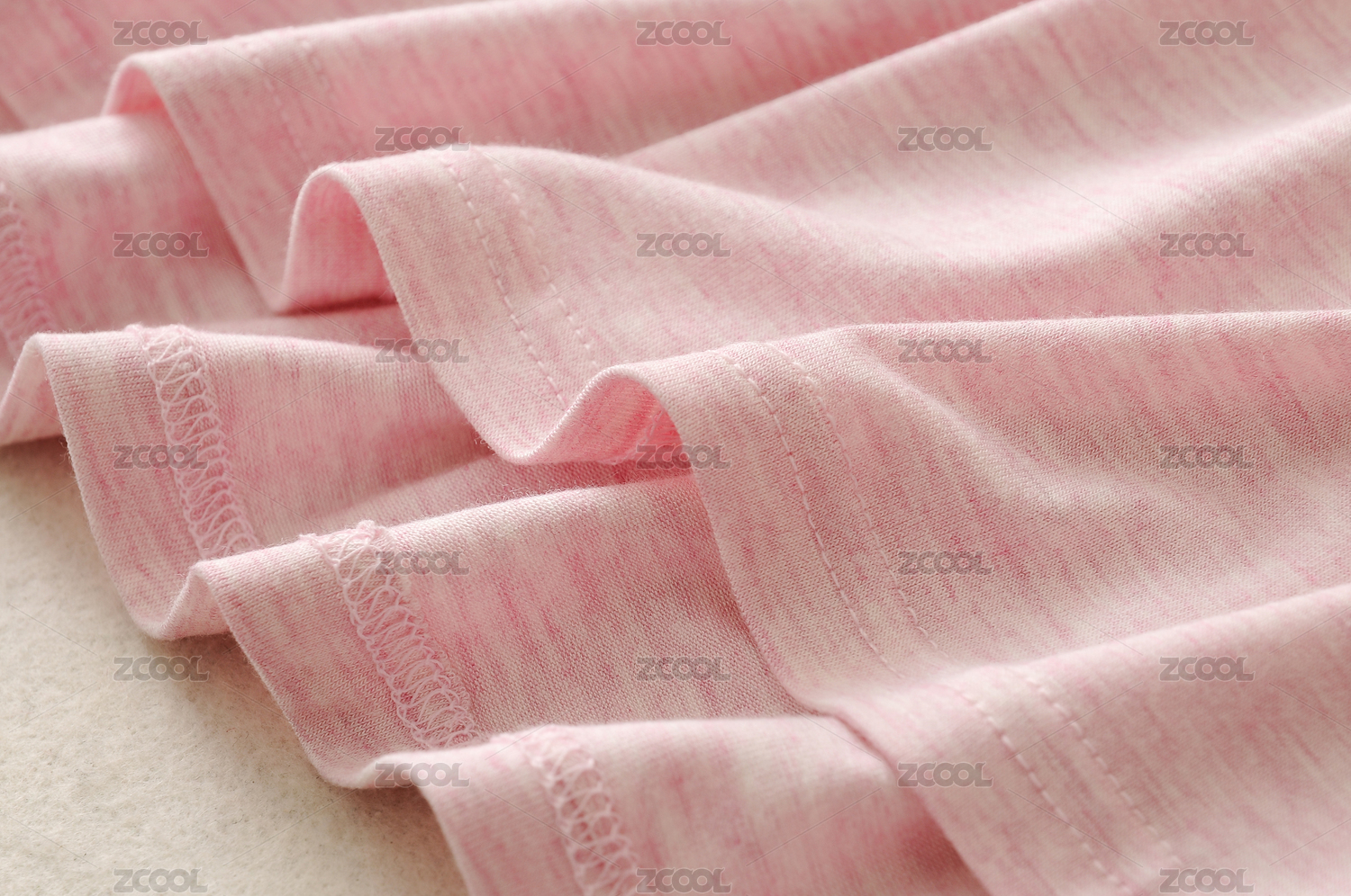 粉色T恤衫下摆收边针脚及面料细节特写