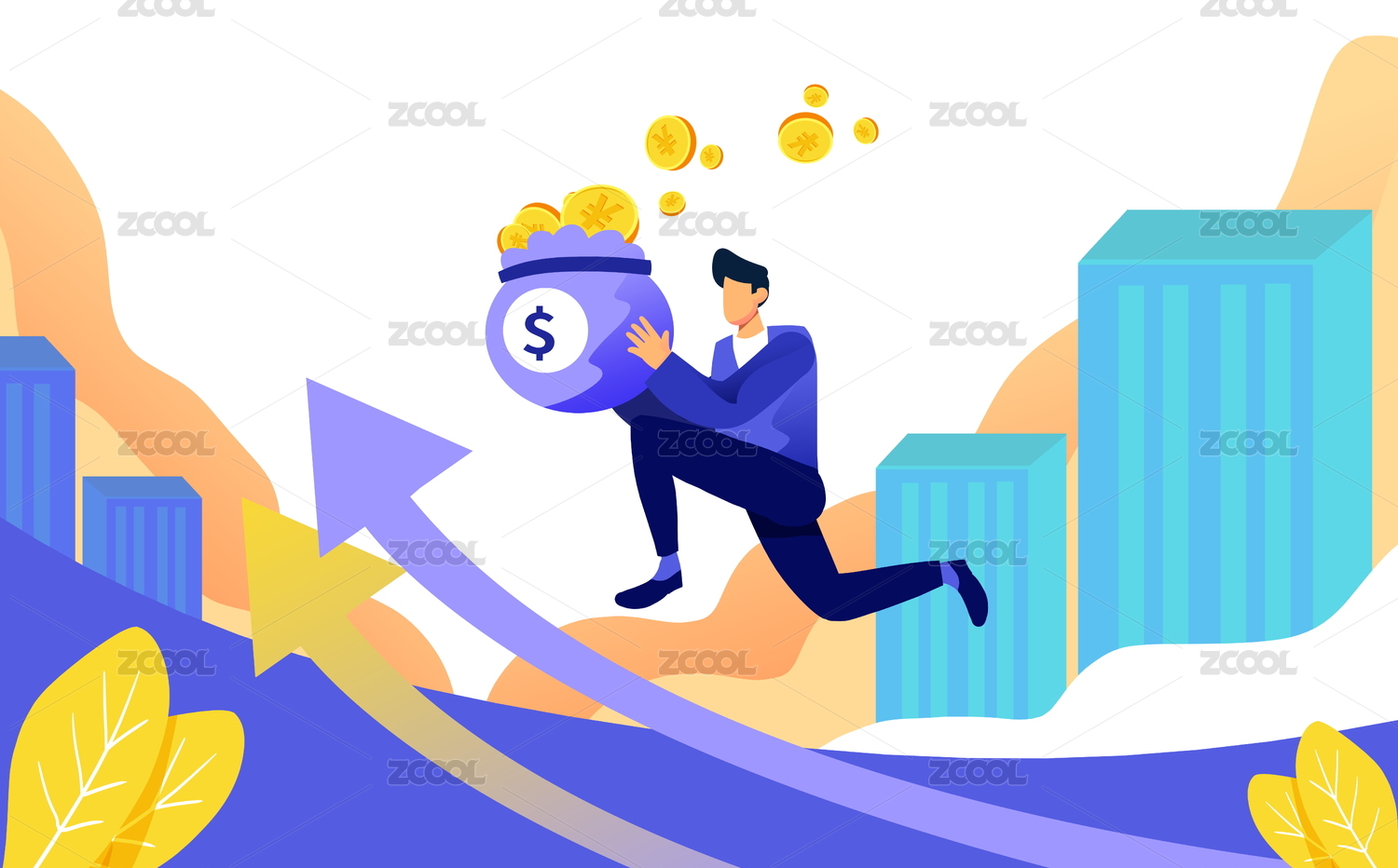 卡通手绘男人手持金币财富赚钱网络经济上涨插画