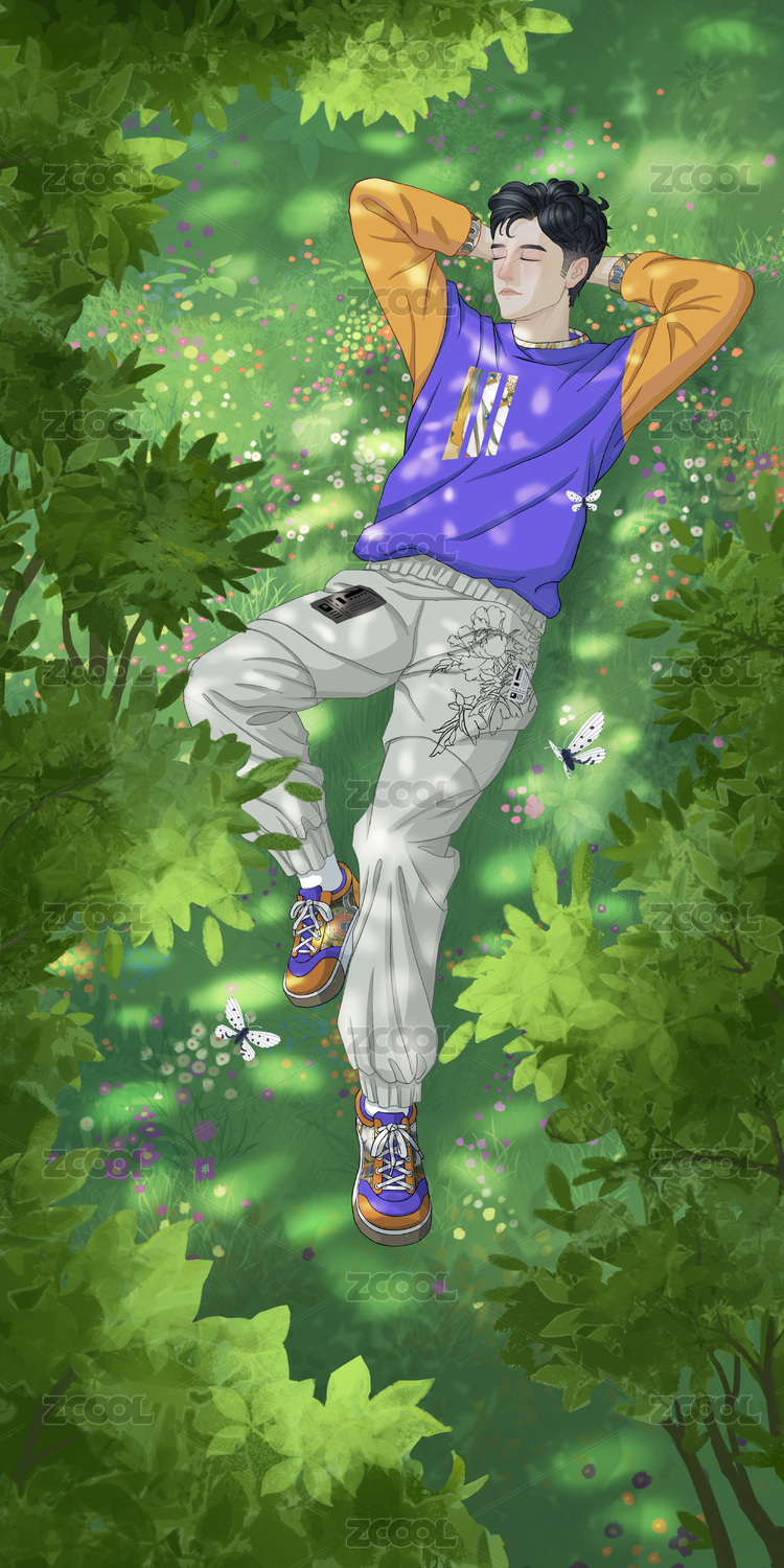 春季男子躺在花儿盛开的草地