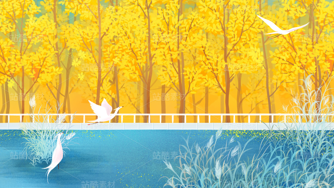 秋分节气金秋湖泊白鹭芦苇丛树林插画