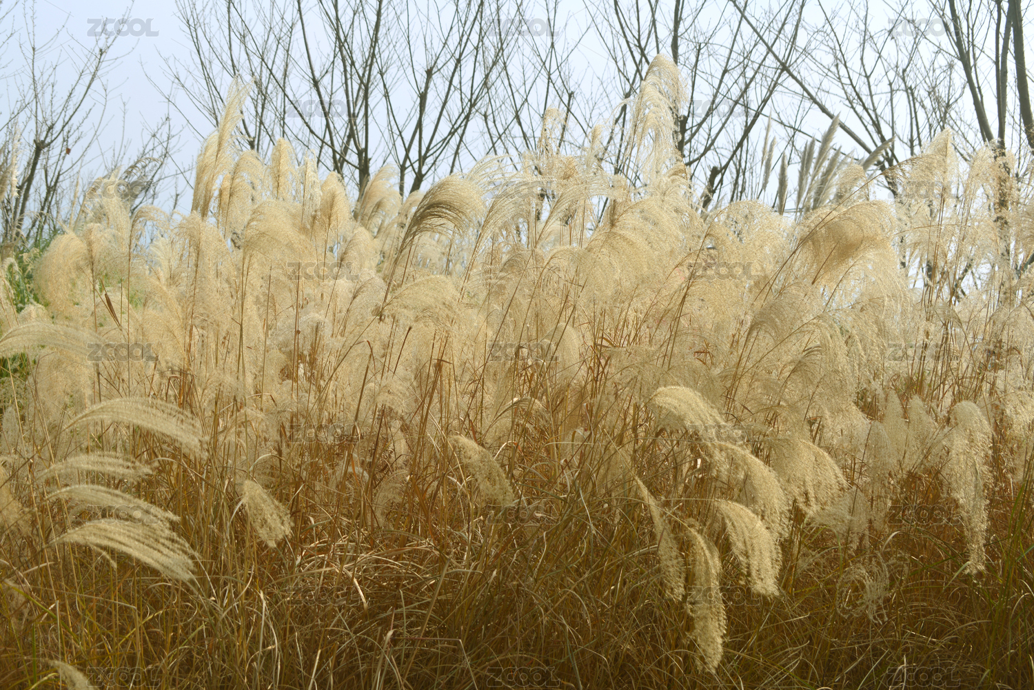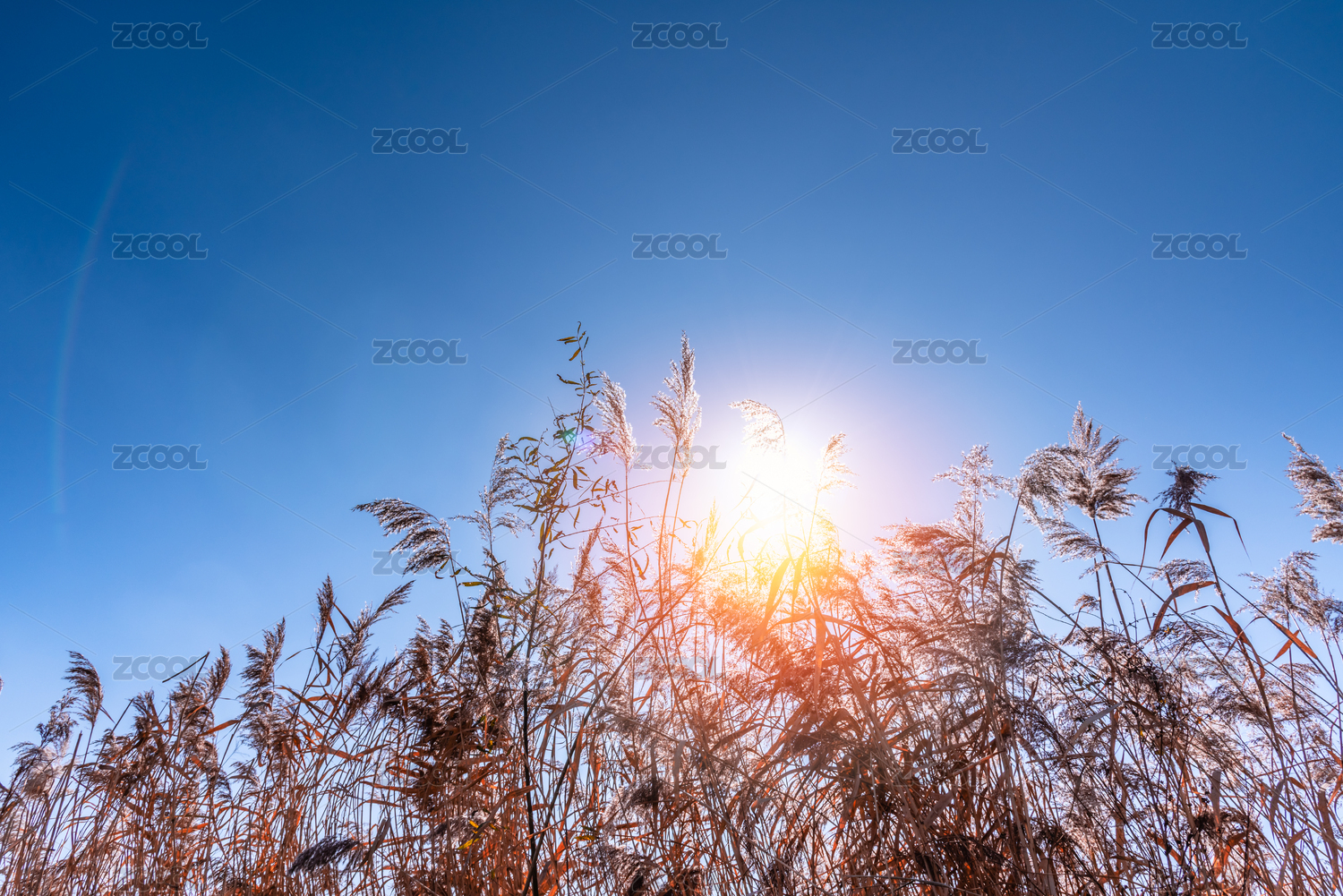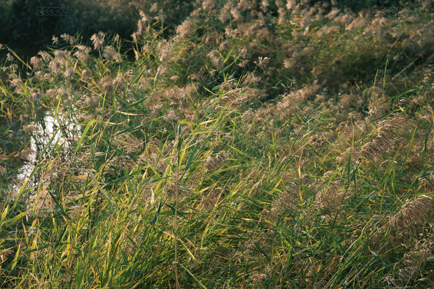 秋天夕阳下的扬州运河三湾河岸的河岸芦苇丛