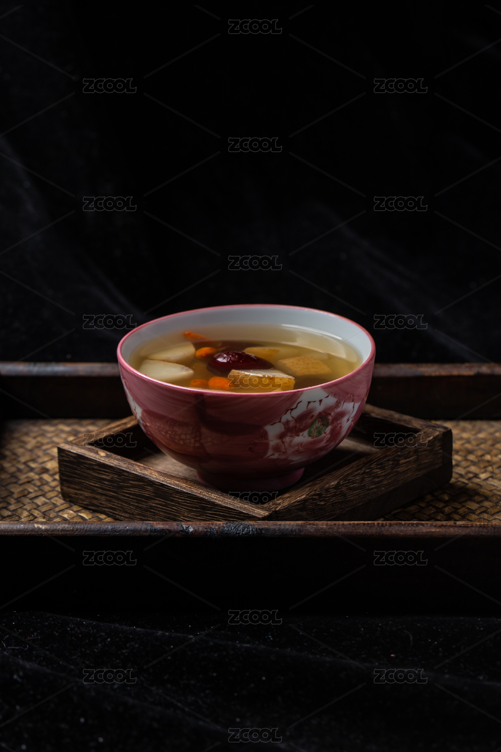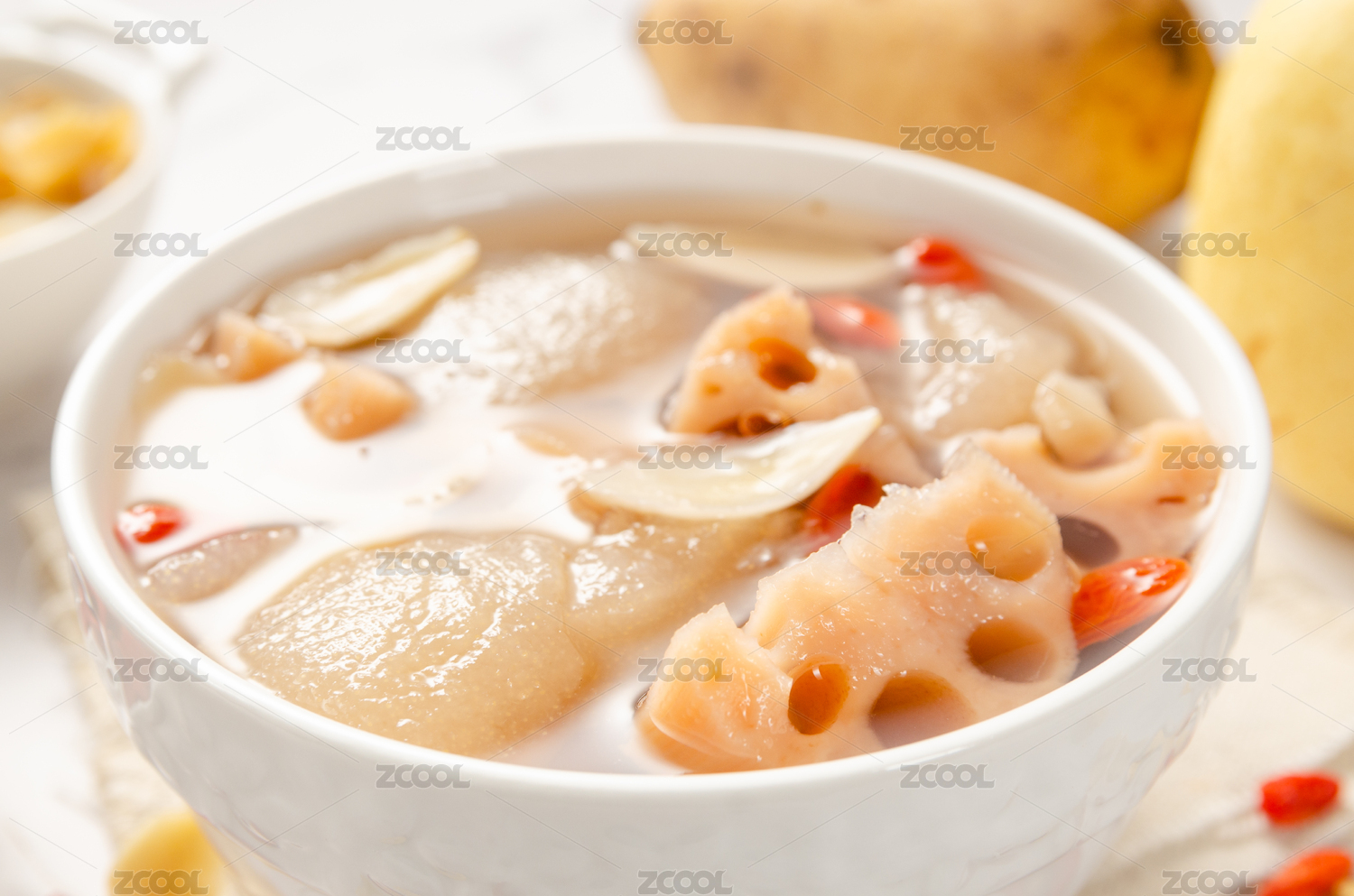 一碗养生汤品雪梨莲藕百合汤放在餐桌上