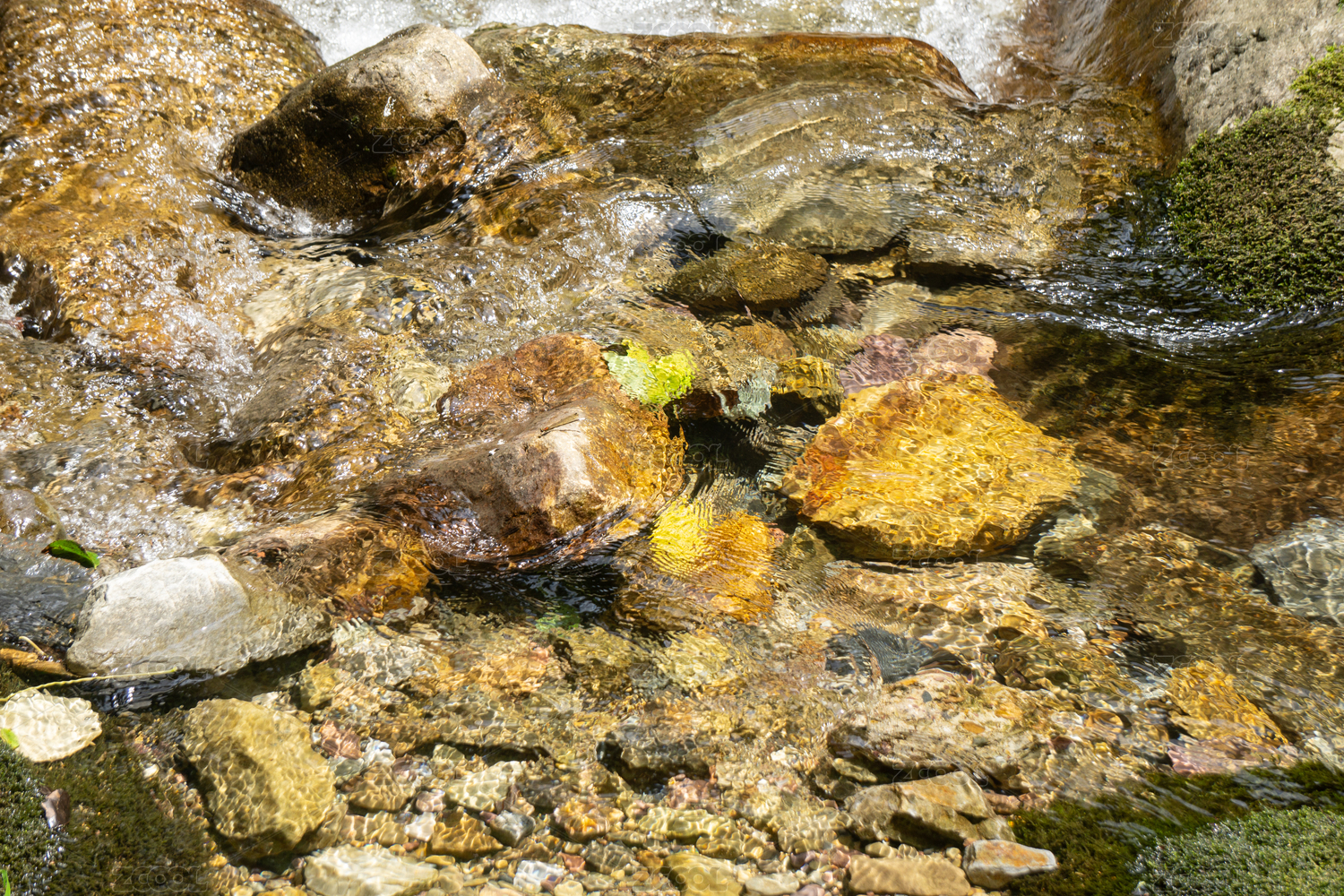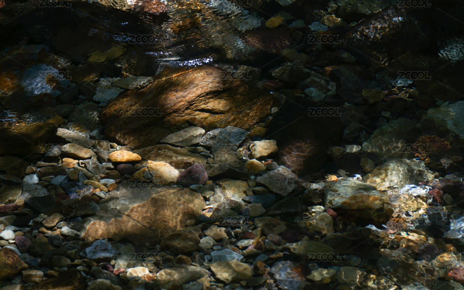 中国成都雅安龙苍沟阳光下斑驳的水跟石头