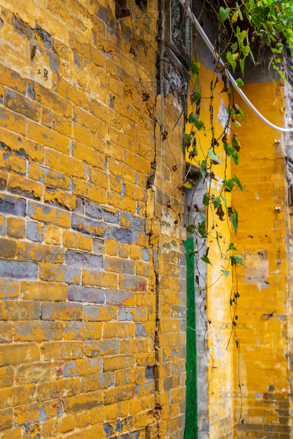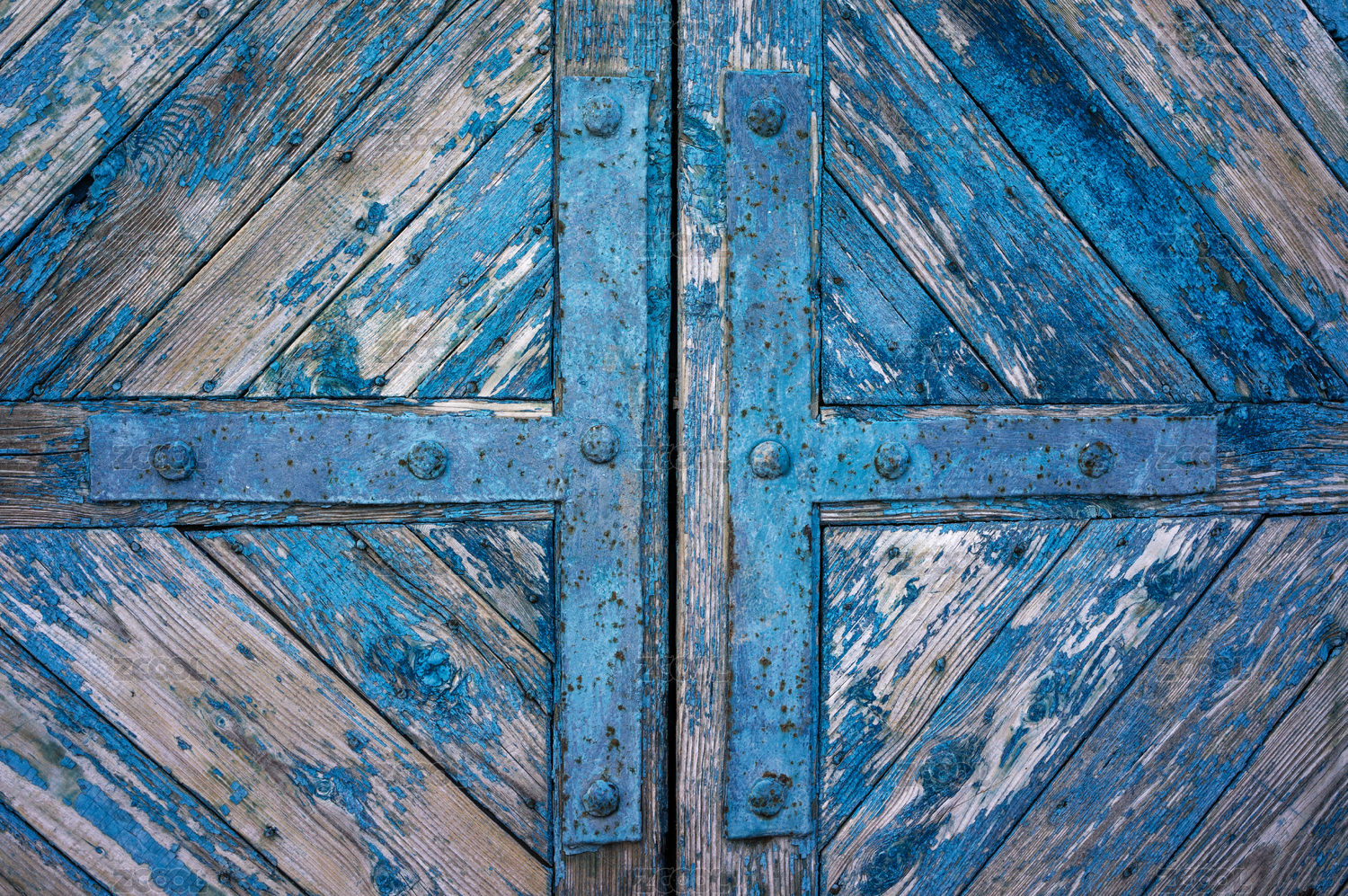 一扇年代久远的古朴斑驳蓝色油漆仓库木门