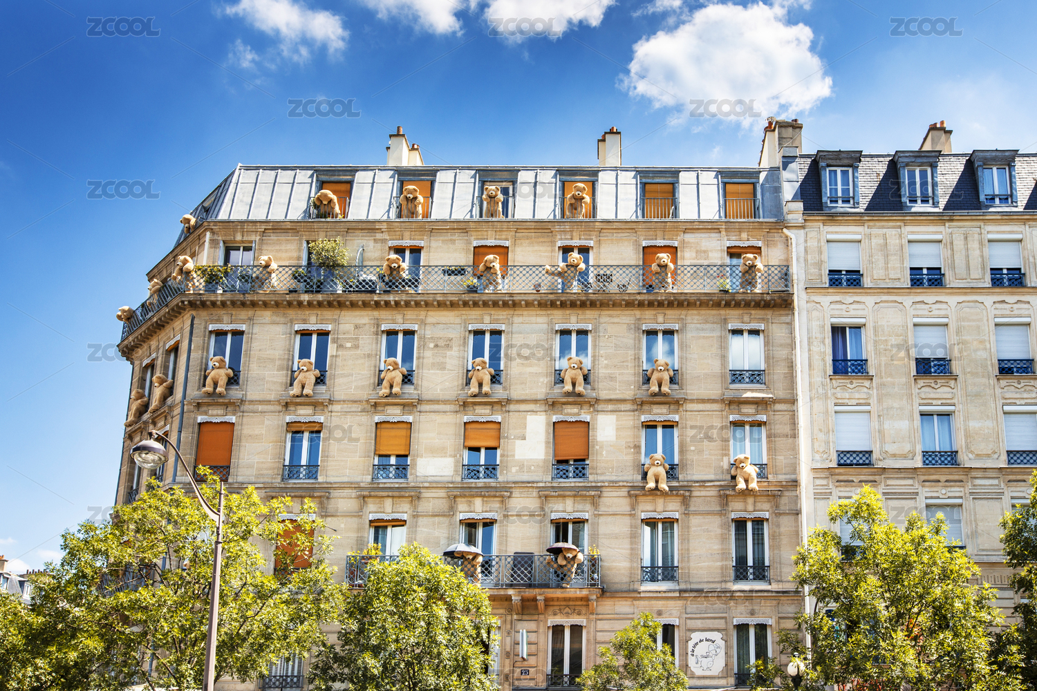 法国巴黎一栋临街楼房窗口摆放着各种姿势的毛绒玩具熊