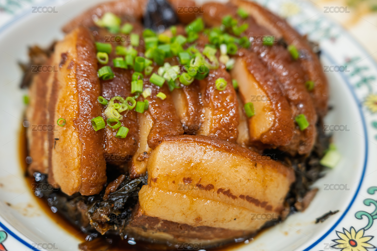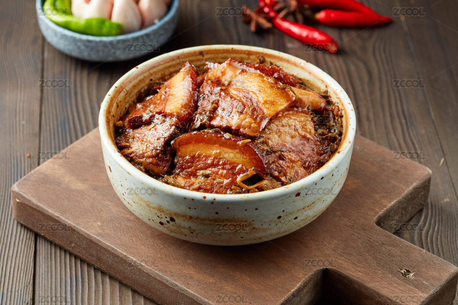 托盘上的梅菜扣肉和旁边的肉夹馍