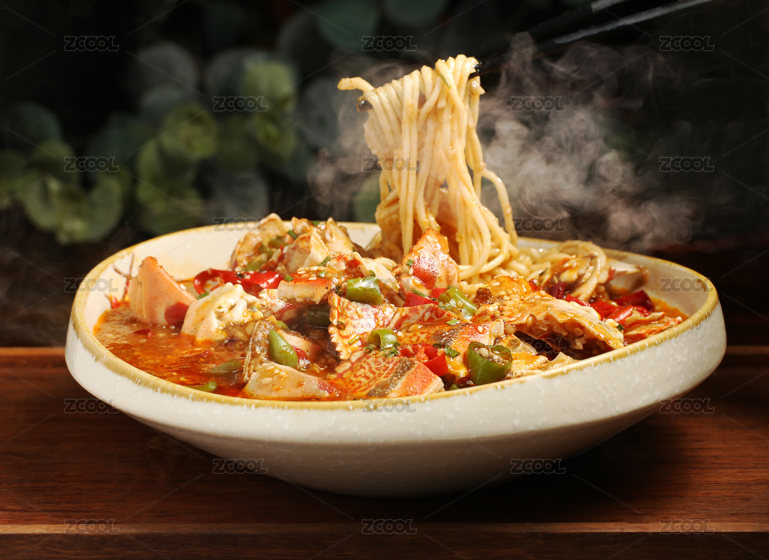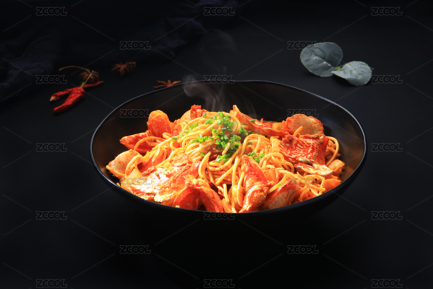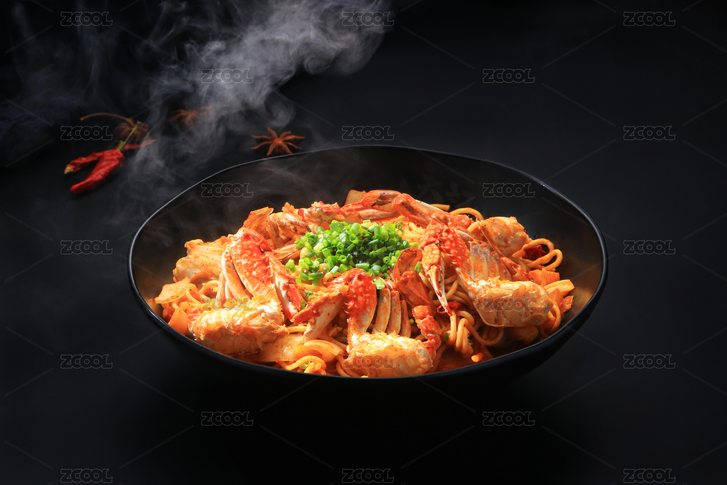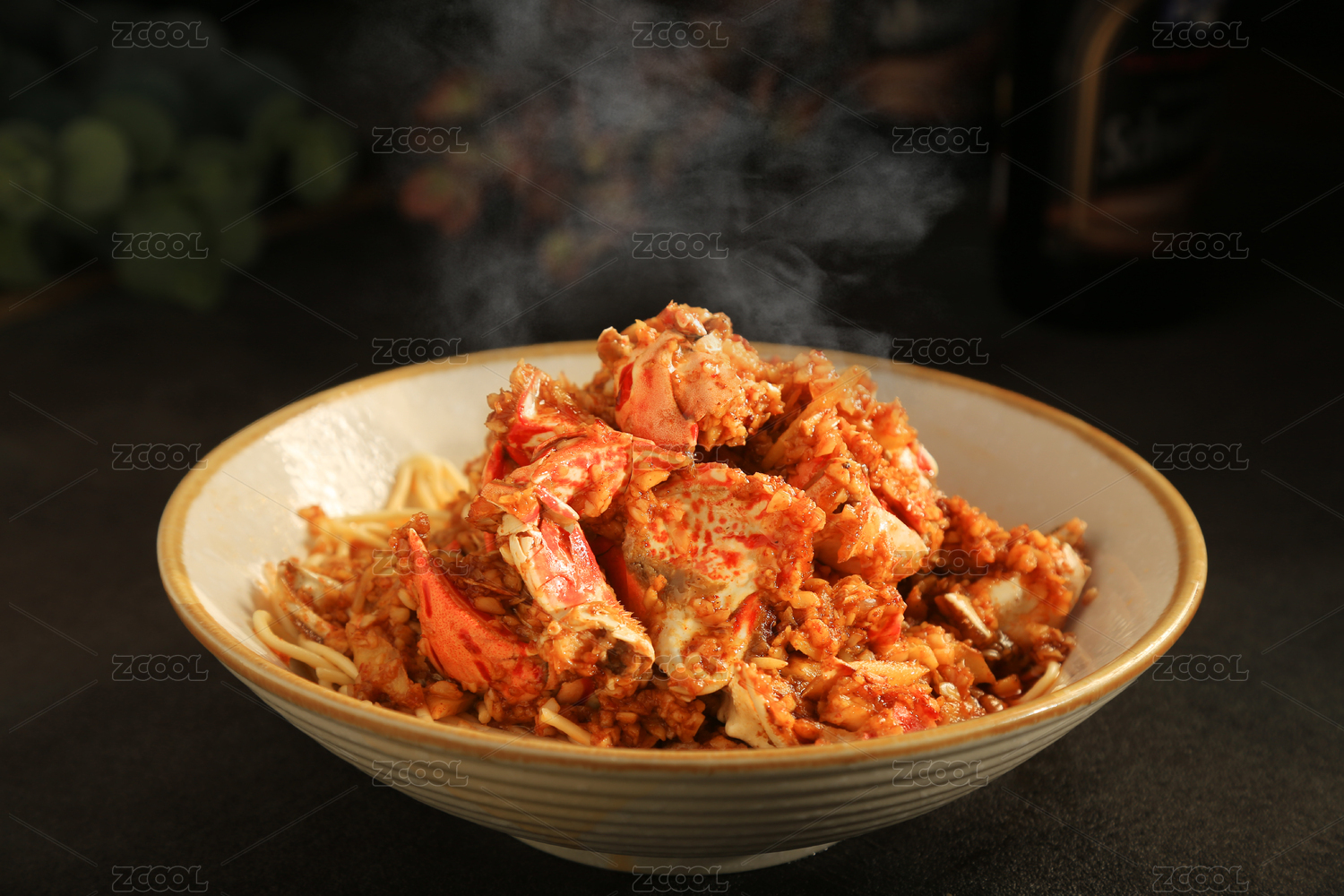 深灰色背景上一碗冒着热气的蟹脚面