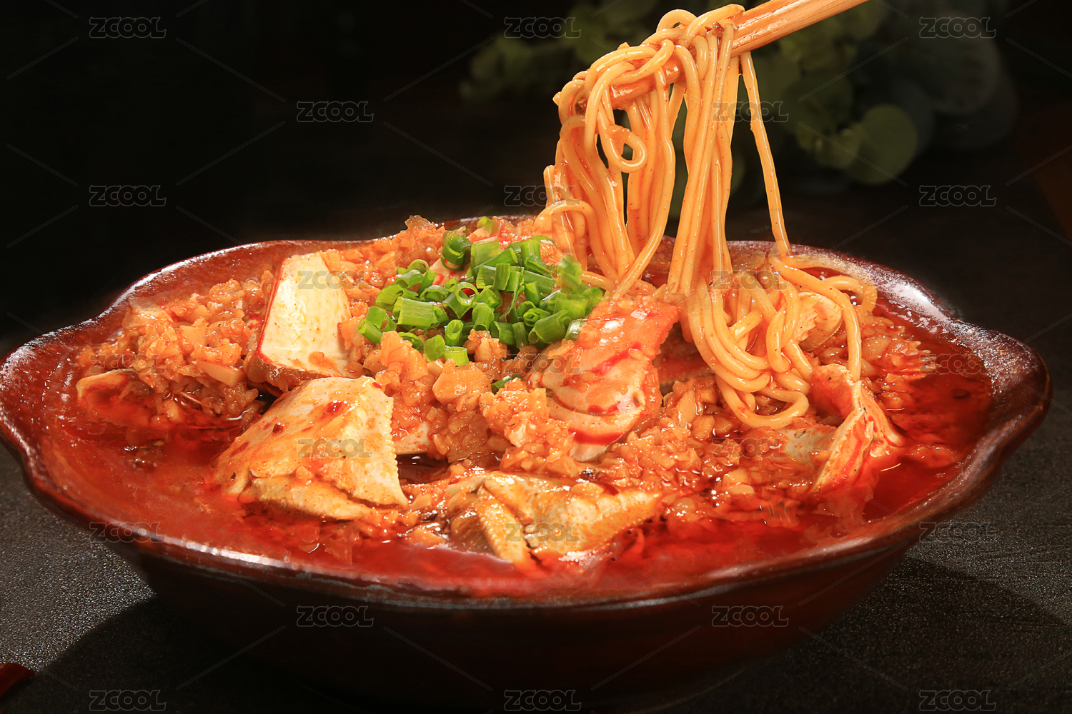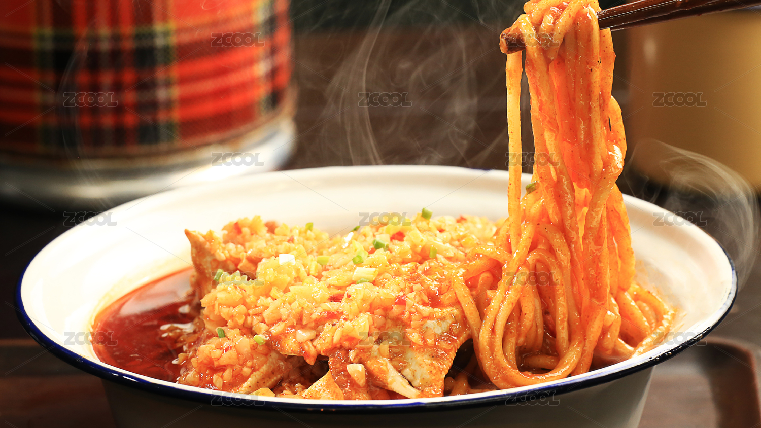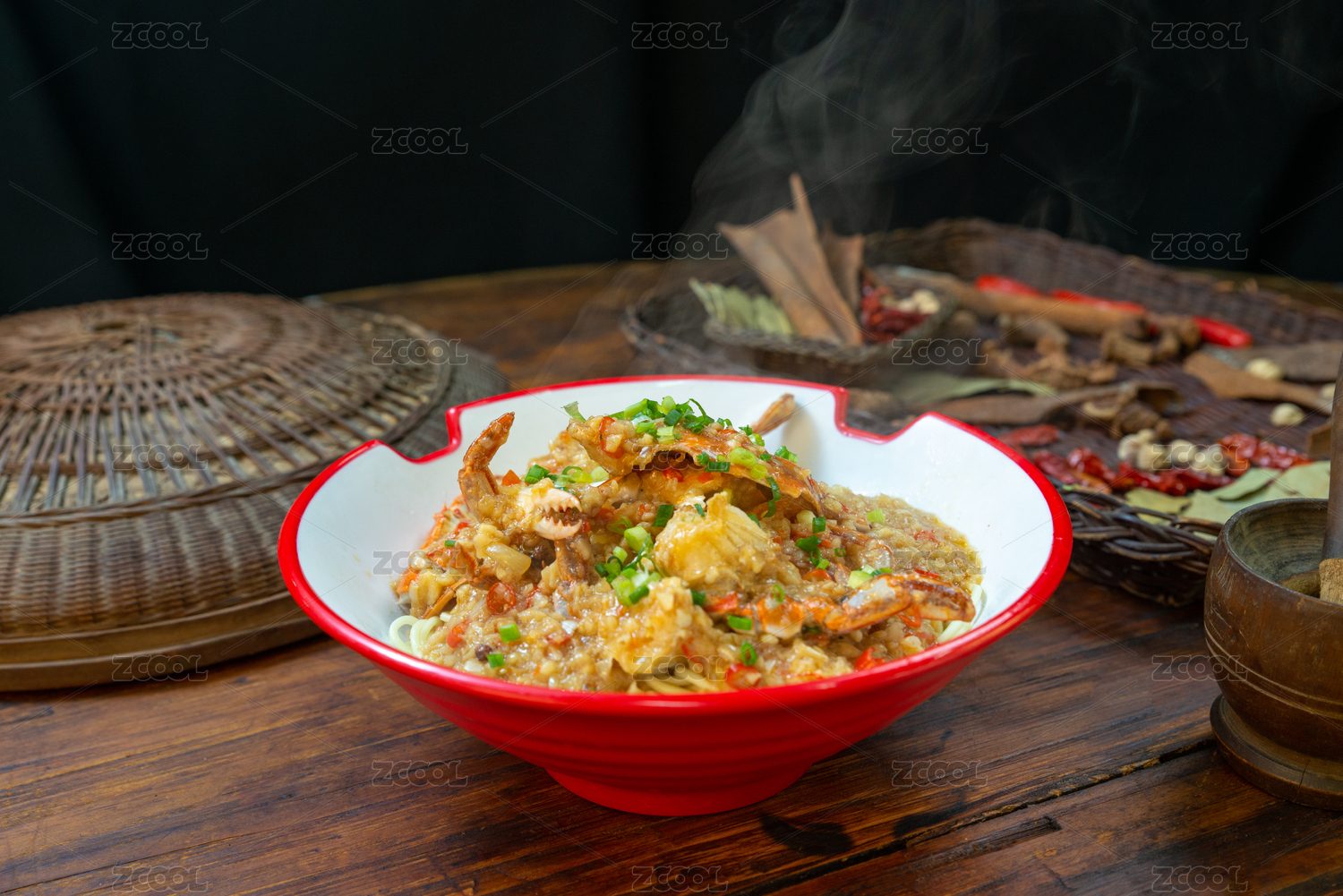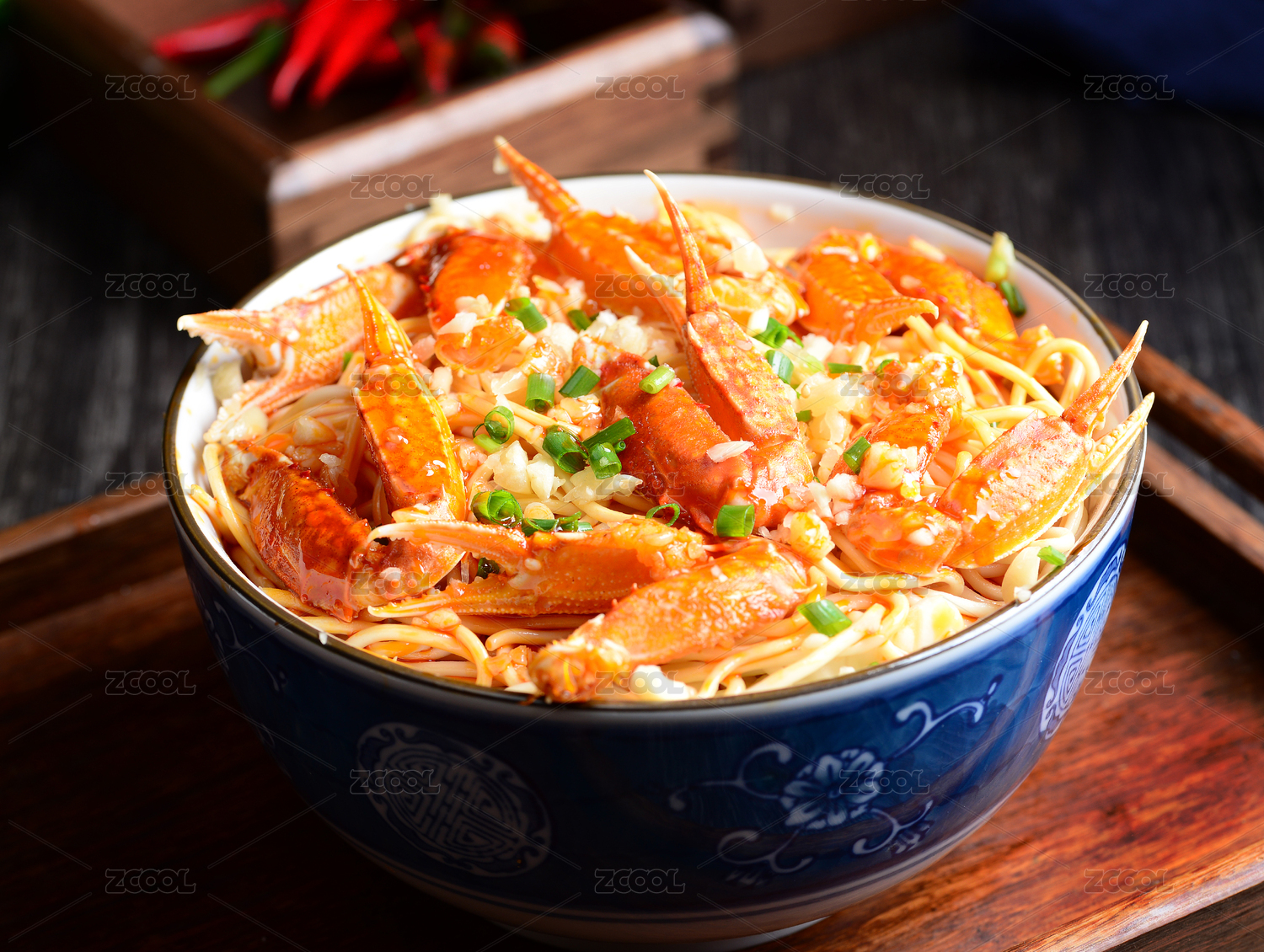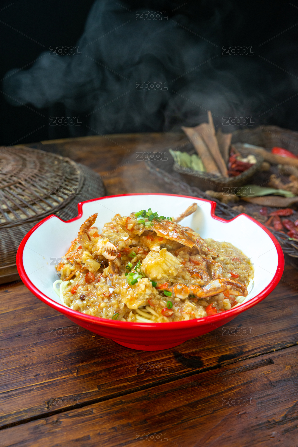 深灰色背景上一碗冒着热气的蟹脚面