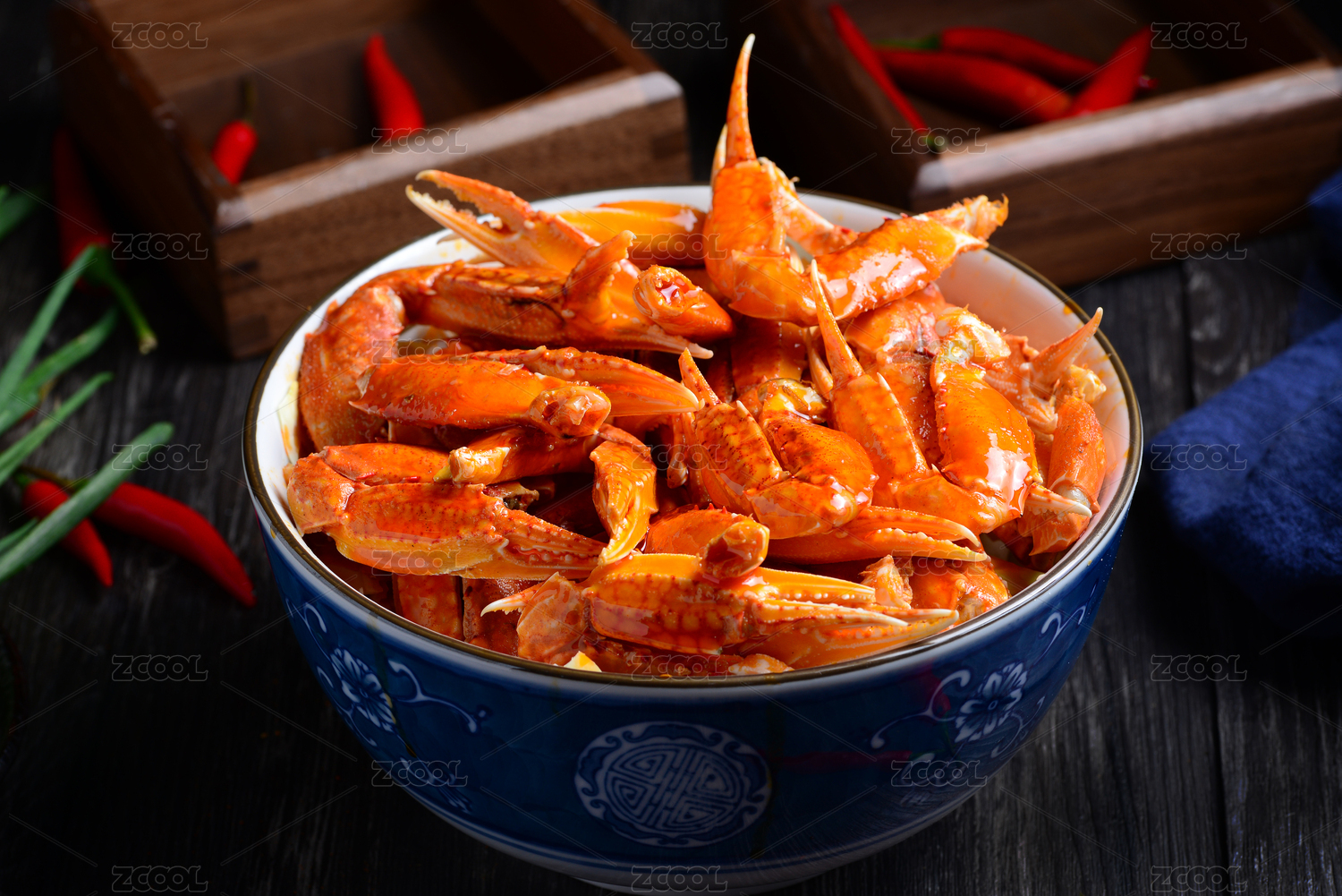深色背景上用一个黑色的碗装的蟹脚面