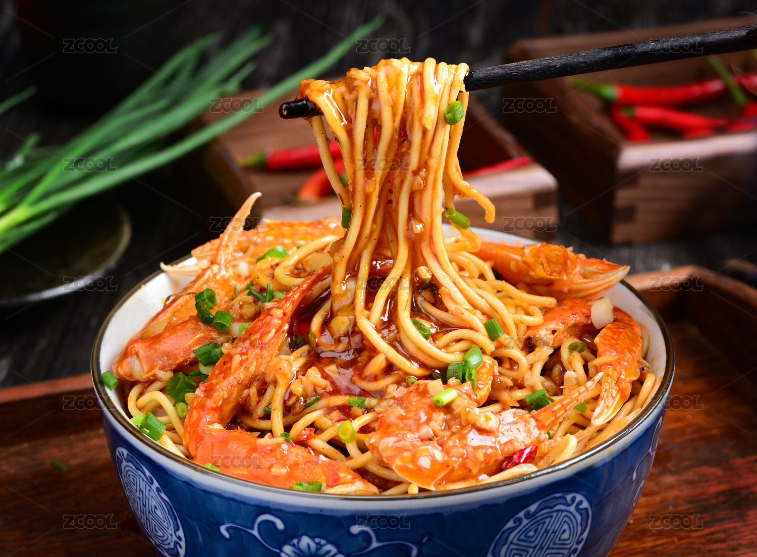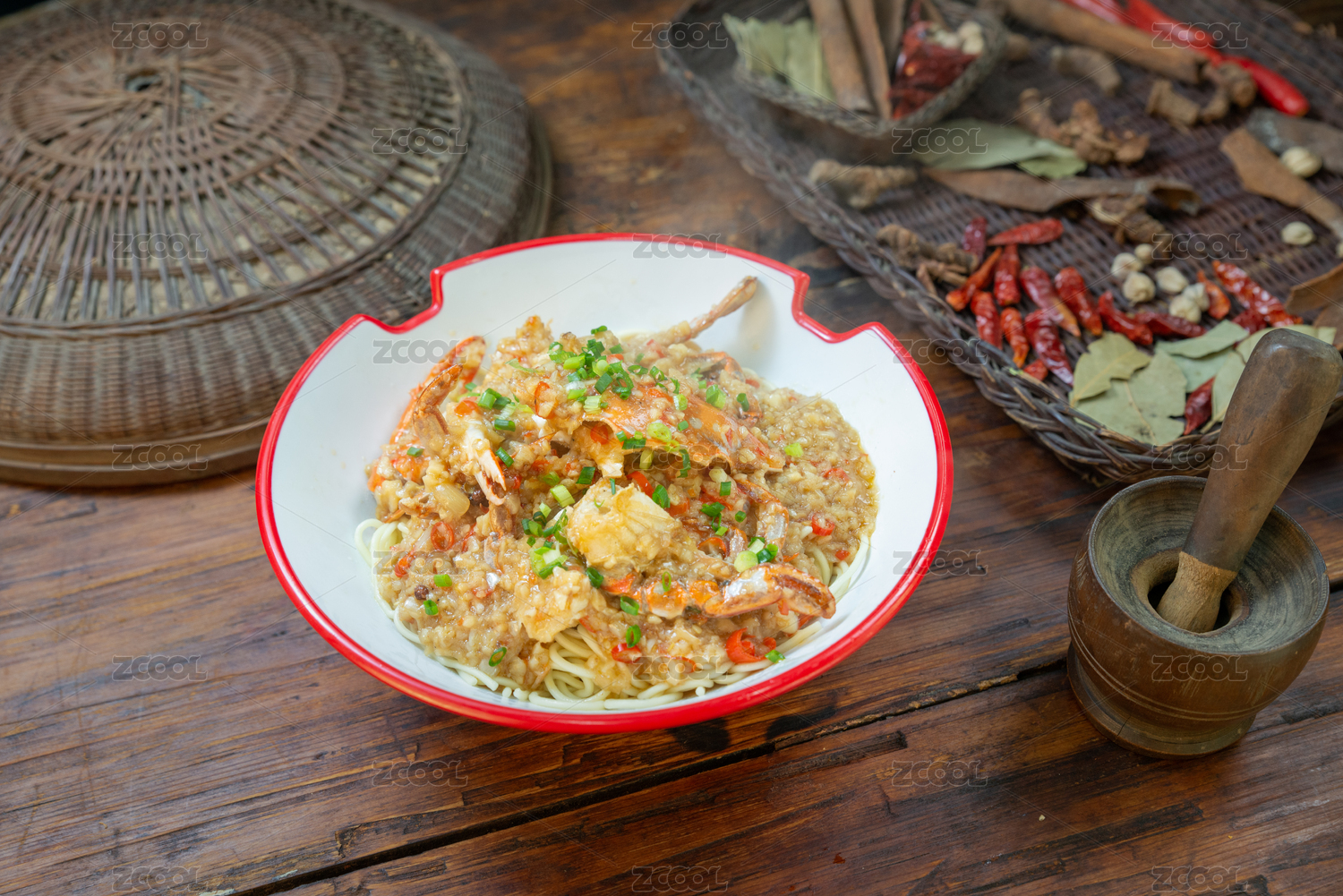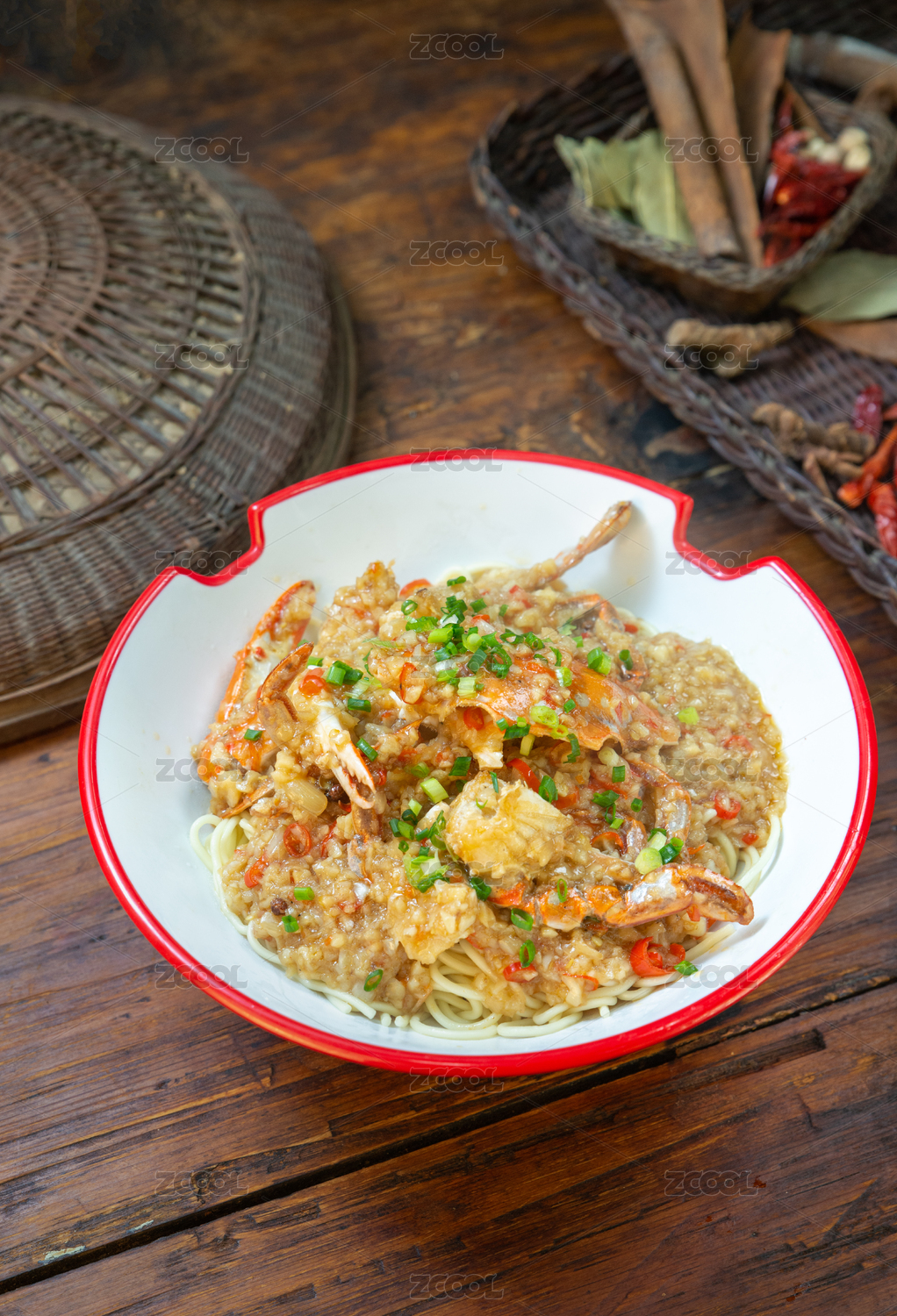 红色木垫板上红边白瓷碗中的蟹脚面