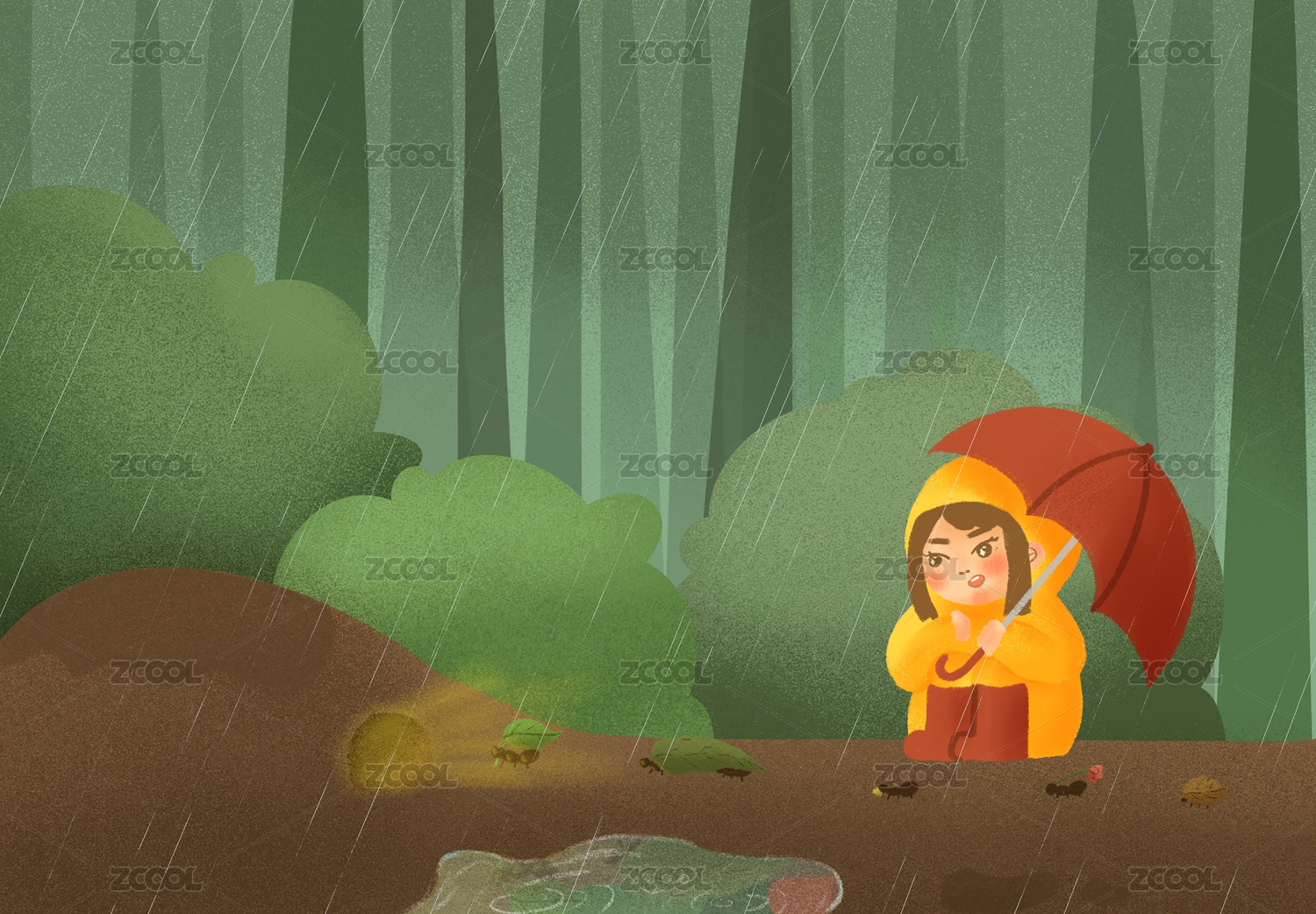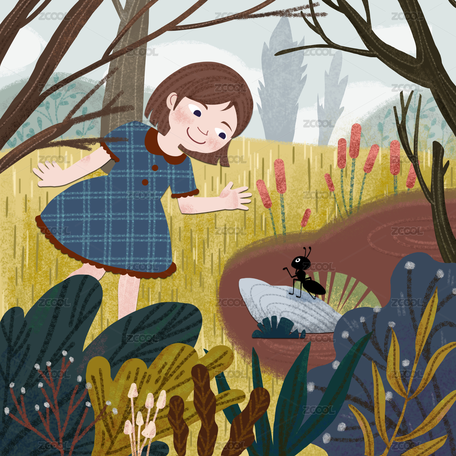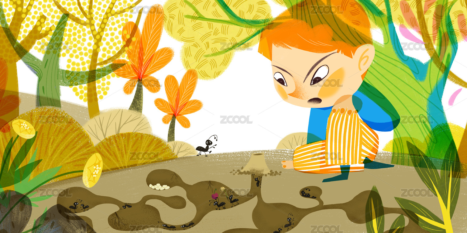 男孩坐在草地上听小蚂蚁演奏儿童绘本插画