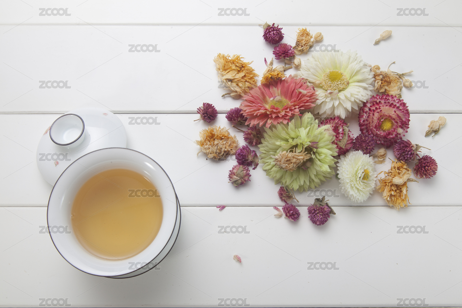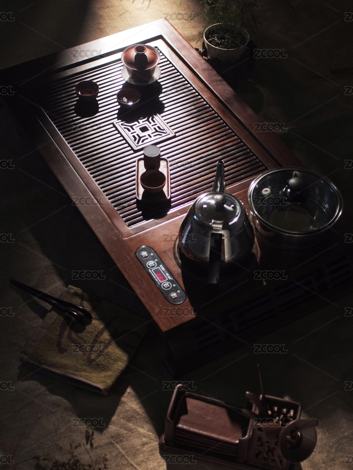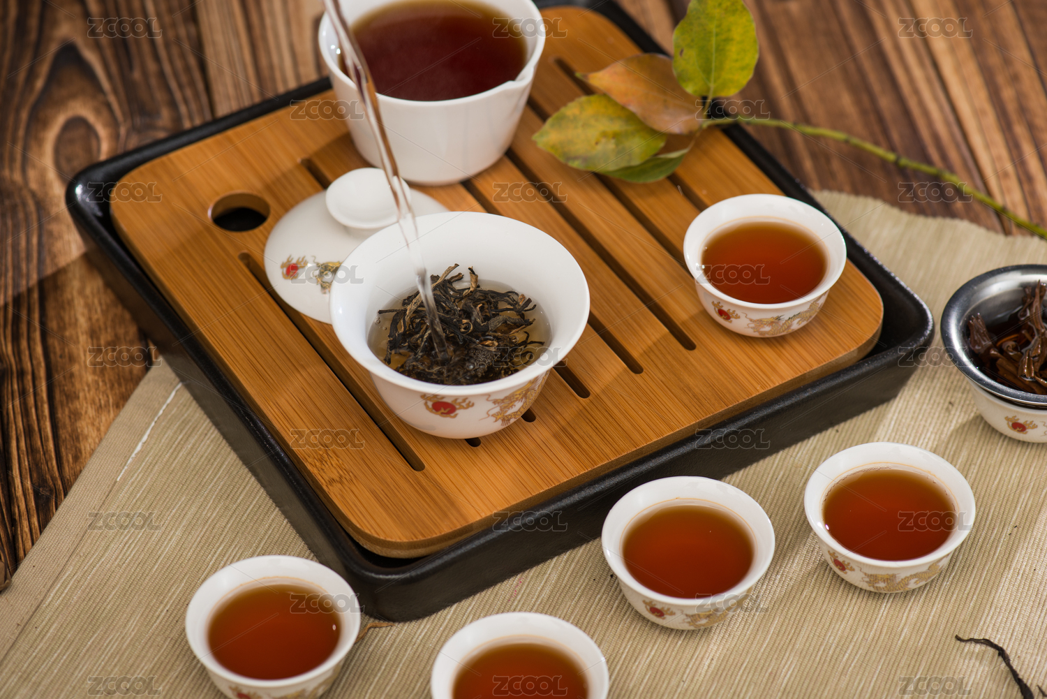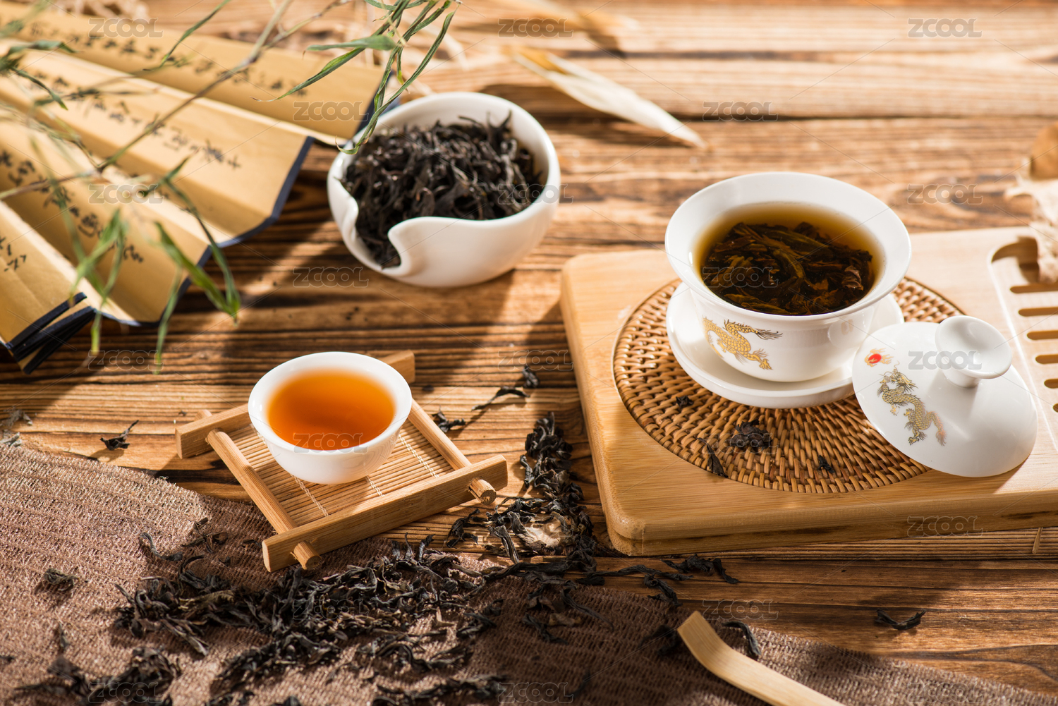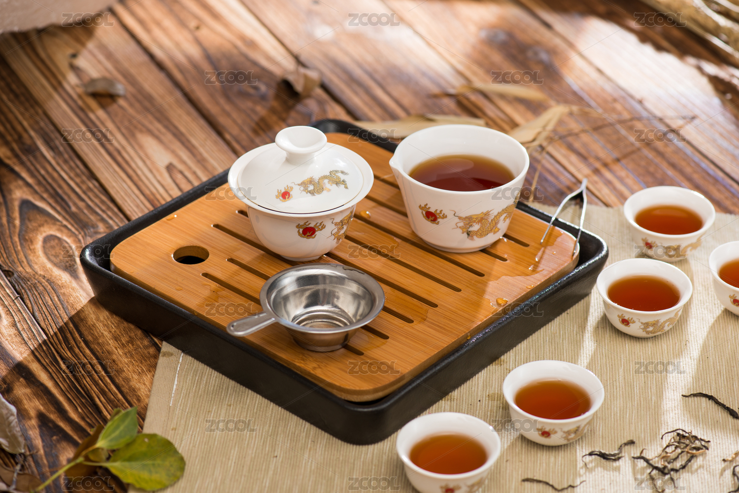 白色瓷器盖碗茶茶杯放在木质功夫茶茶盘上,中国功夫茶冲泡场景