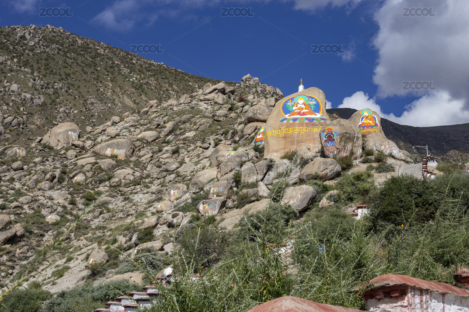 蓝天下中国西藏拉萨的哲蚌寺山上的佛像