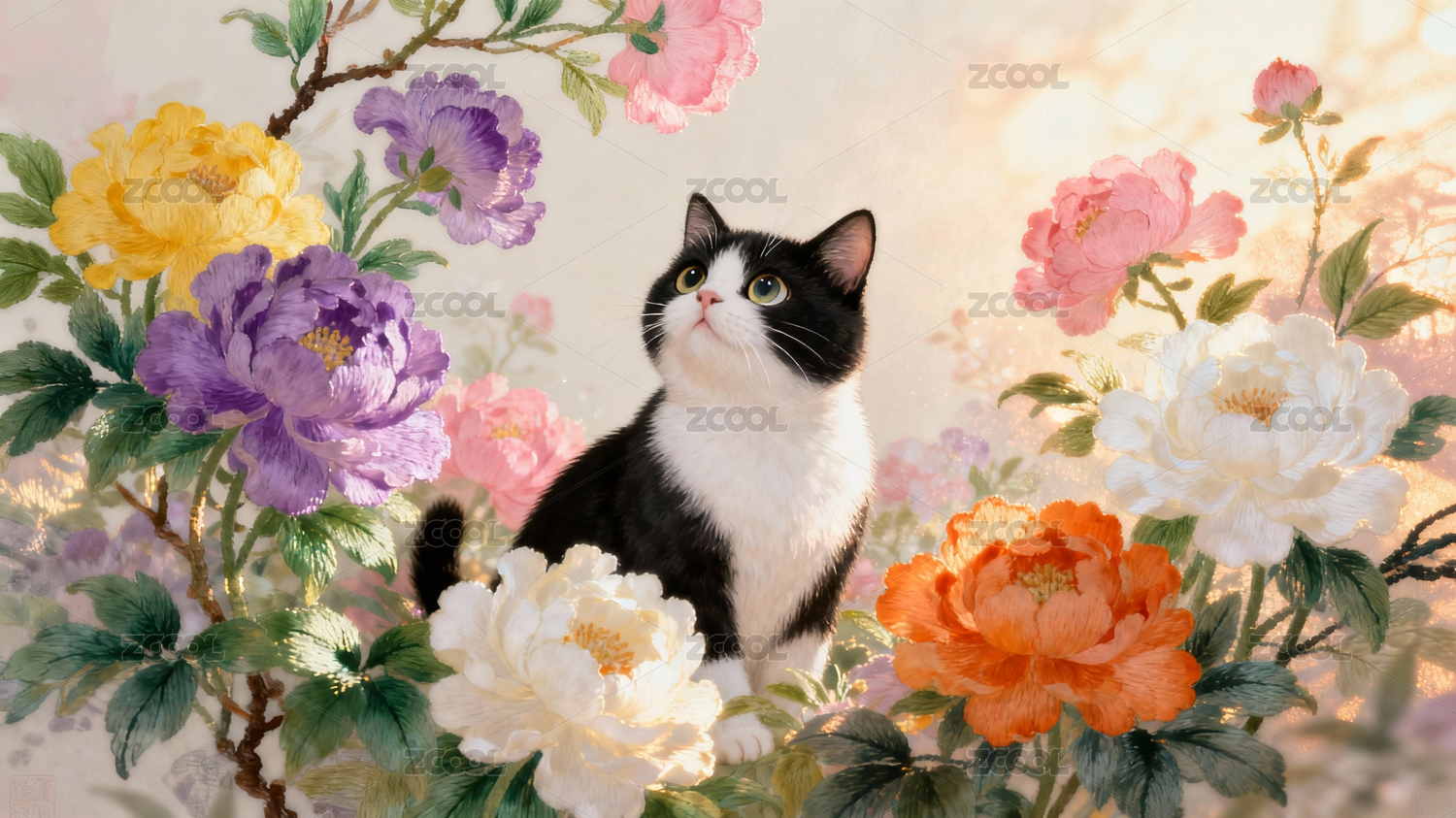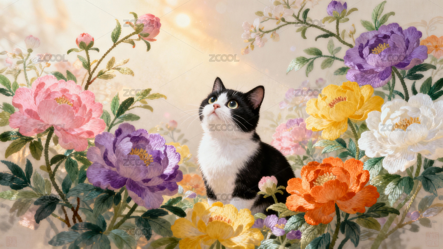 繁花丛中奶油猫浪漫古风肌理苏绣艺术背景