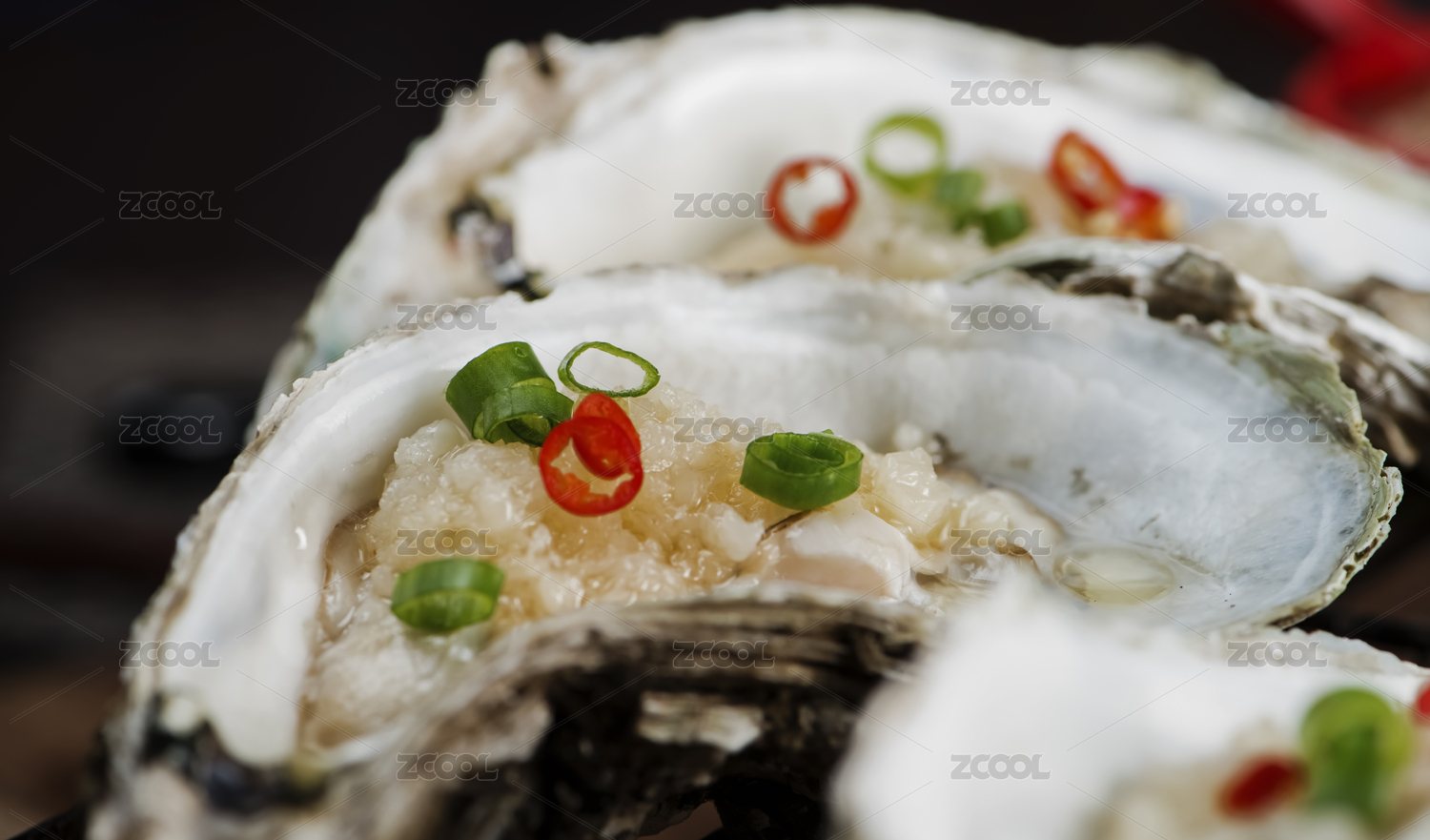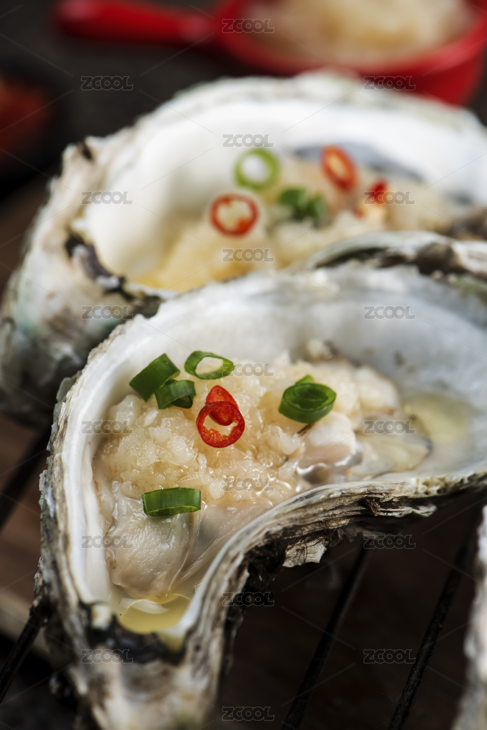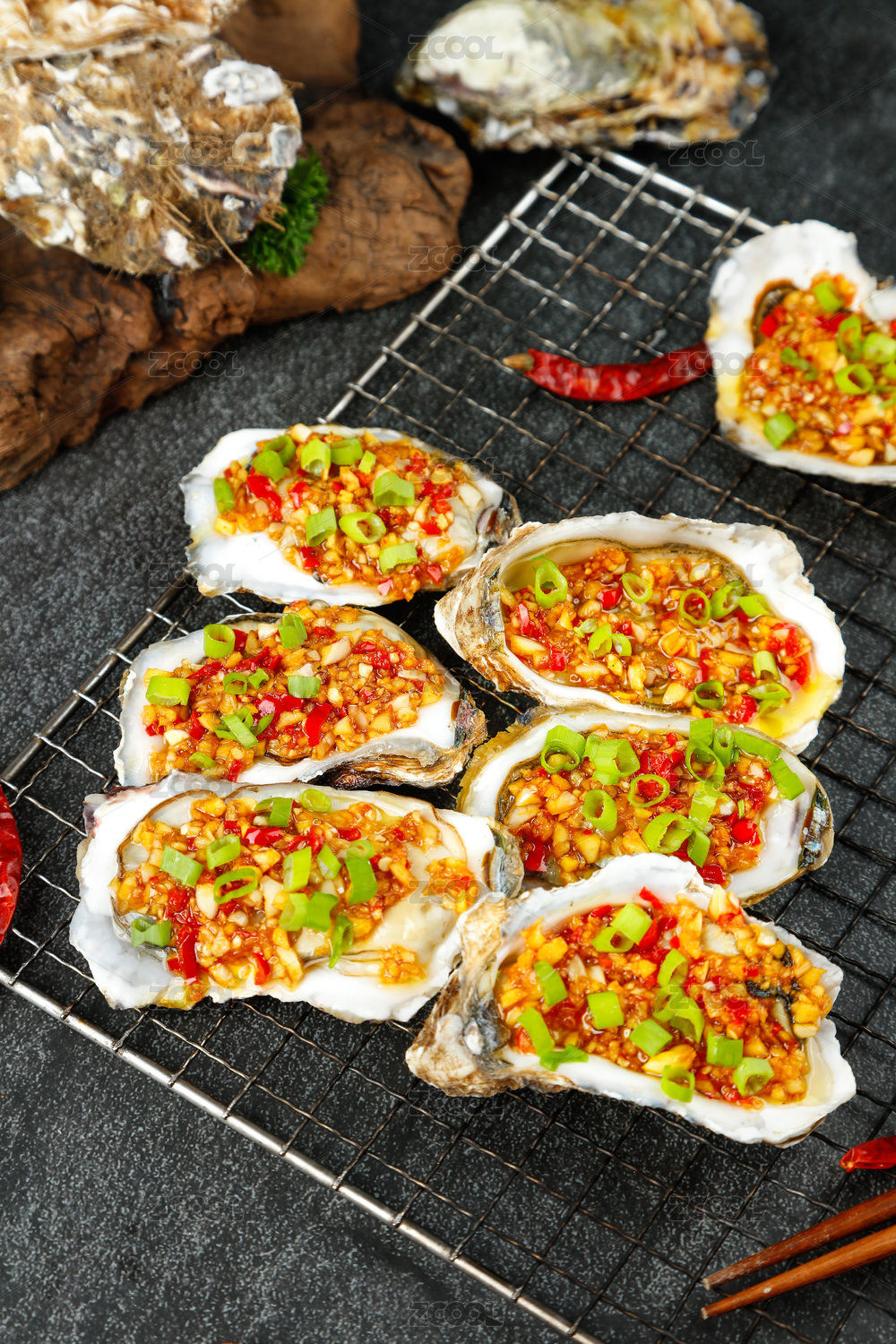 烧烤架上放着剁椒蒜蓉烤生蚝