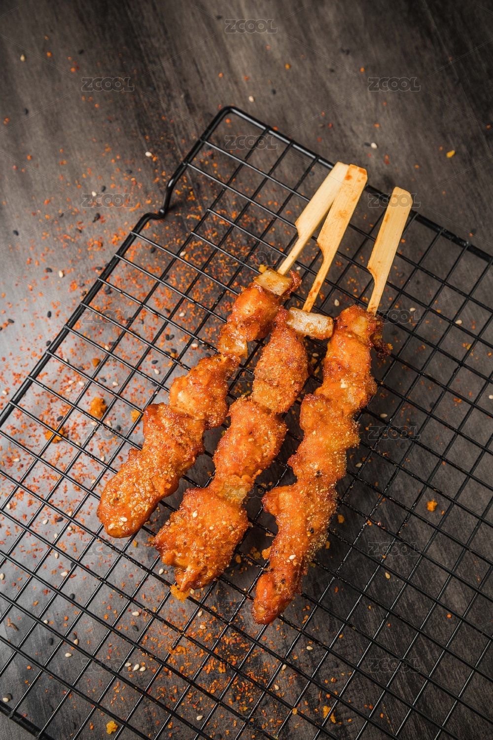 黑色烤架上放着几串撒着辣椒面的油炸骨肉相连