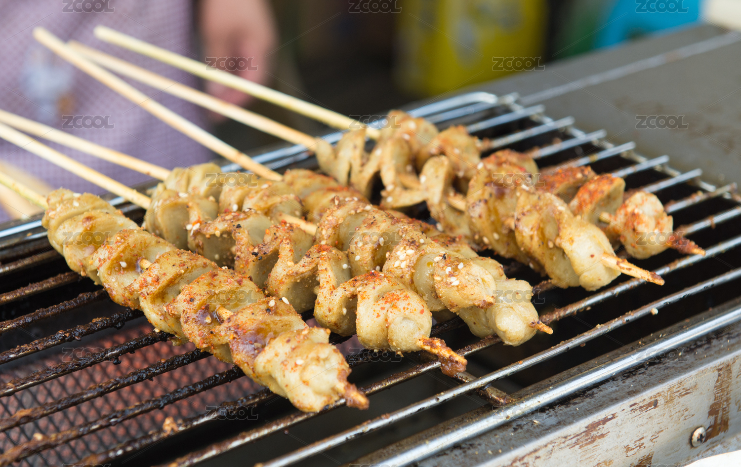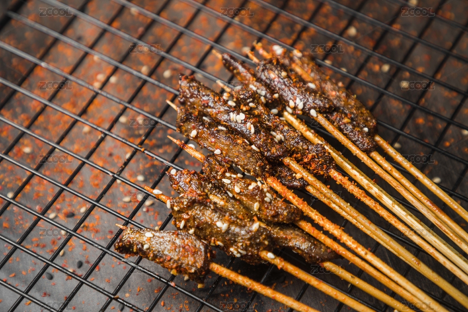 黑色烤架上放着几串撒着辣椒面的油炸肉筋