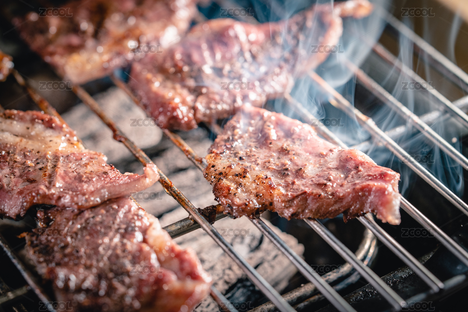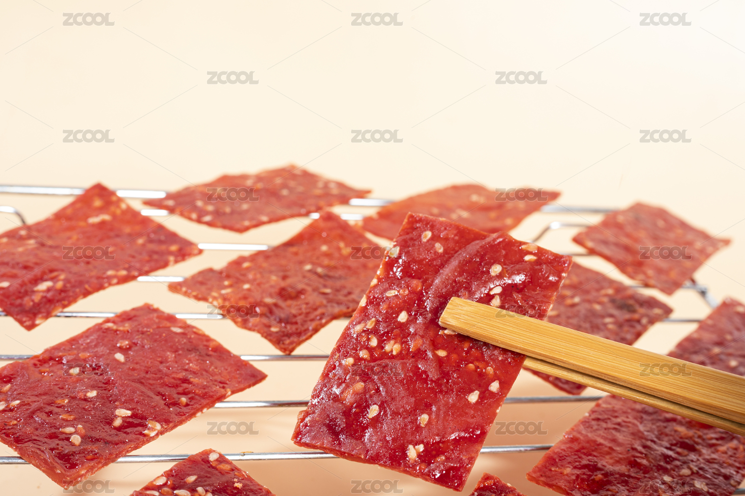 烤架上夹起的红色猪肉脯肉片