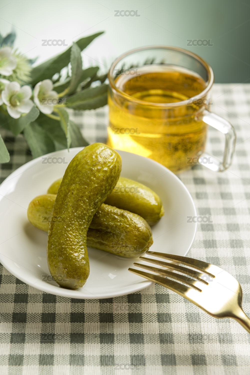 一盘酸黄瓜摆放在格子桌布上特写