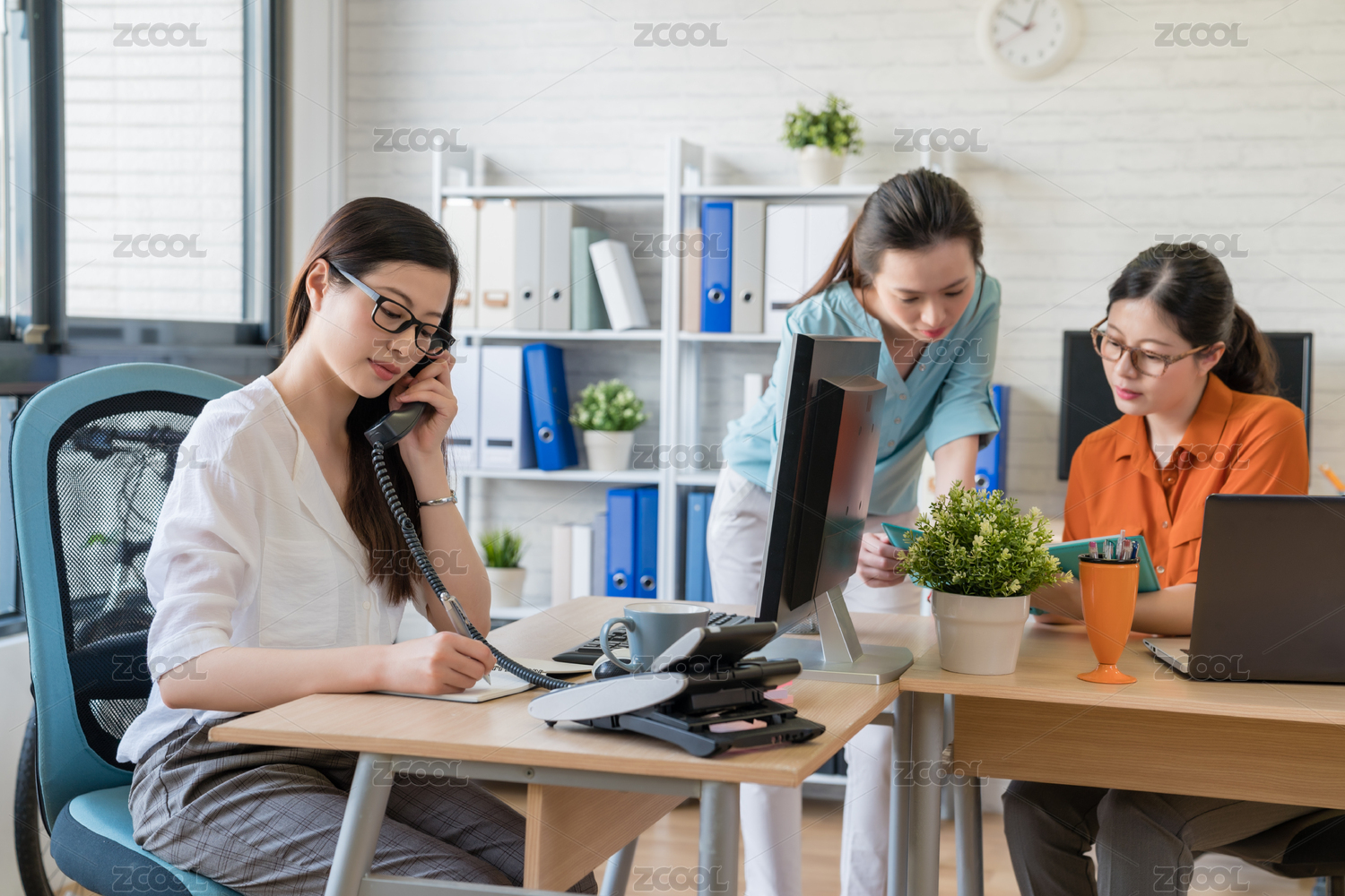 年轻漂亮的经理在电话中谈了一个新的项目,另外两个同事在后台讨论。