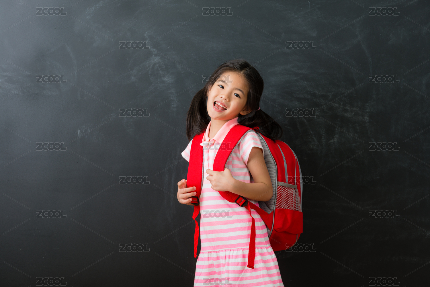 快乐开朗的小孩女学生站在后台背景上的摄像头和搭载准备回书包。
