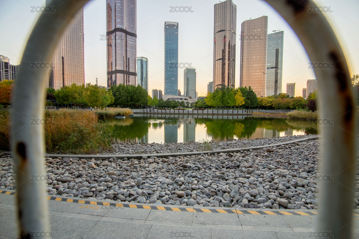 透过公园栅栏远眺中国北京望京CBD楼群建筑