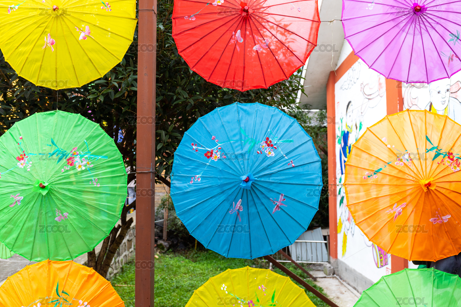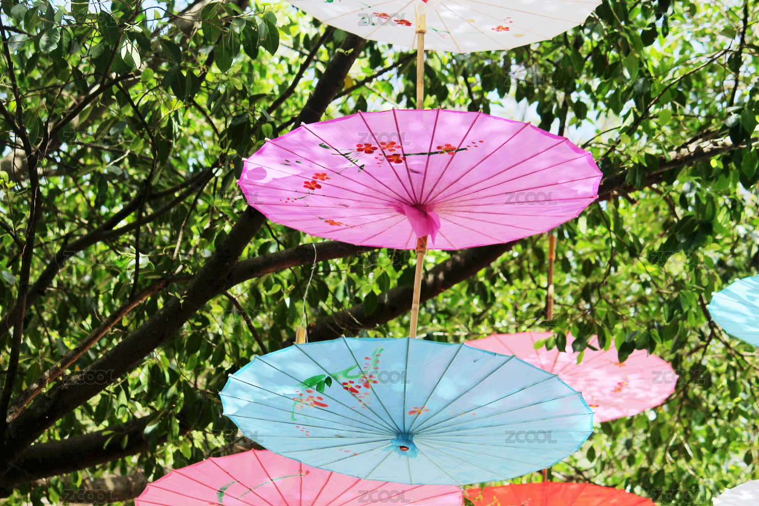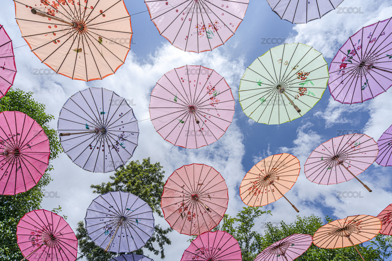 户外的天空中悬挂了多个彩色的艺术纸伞