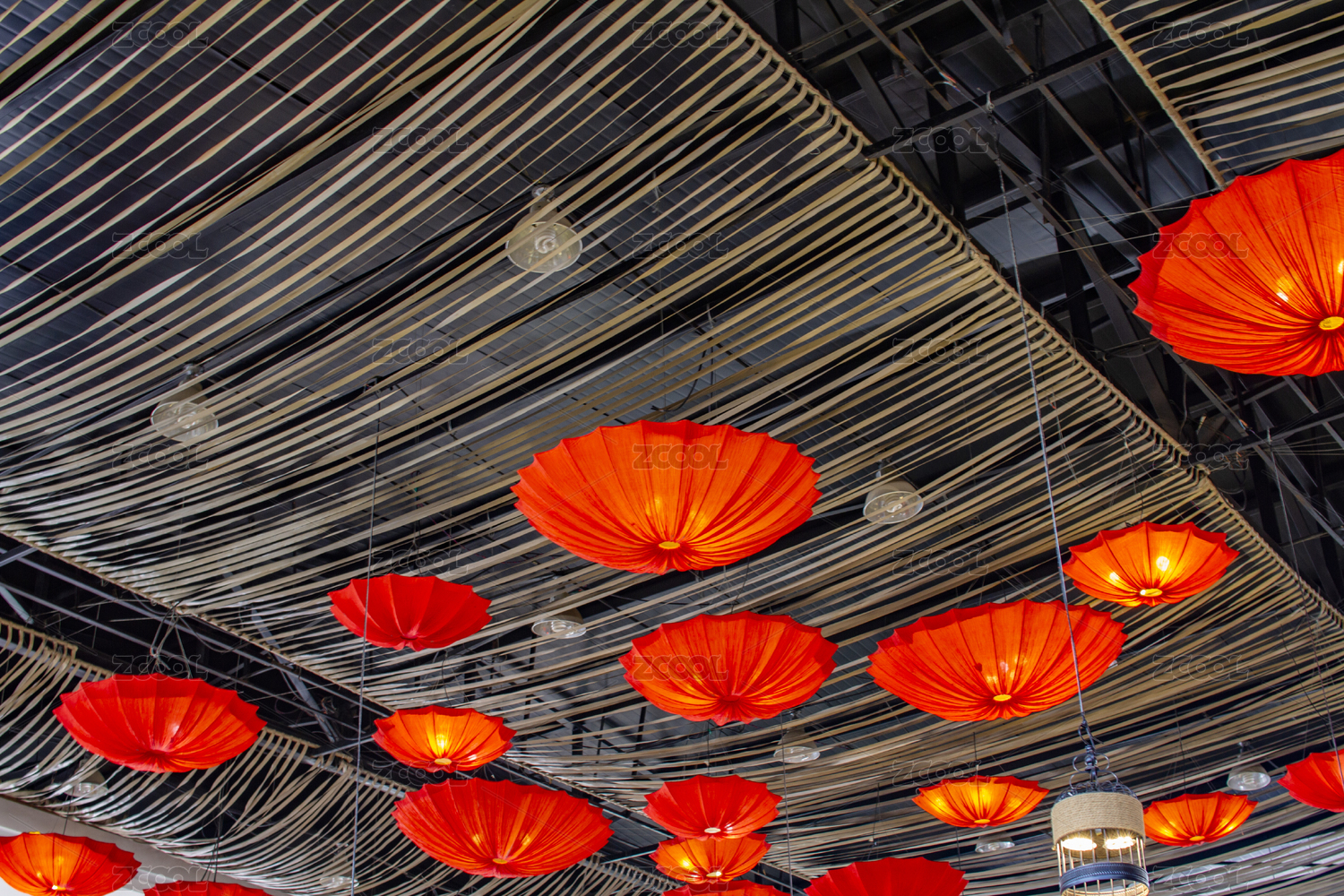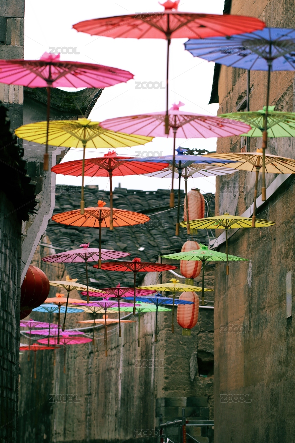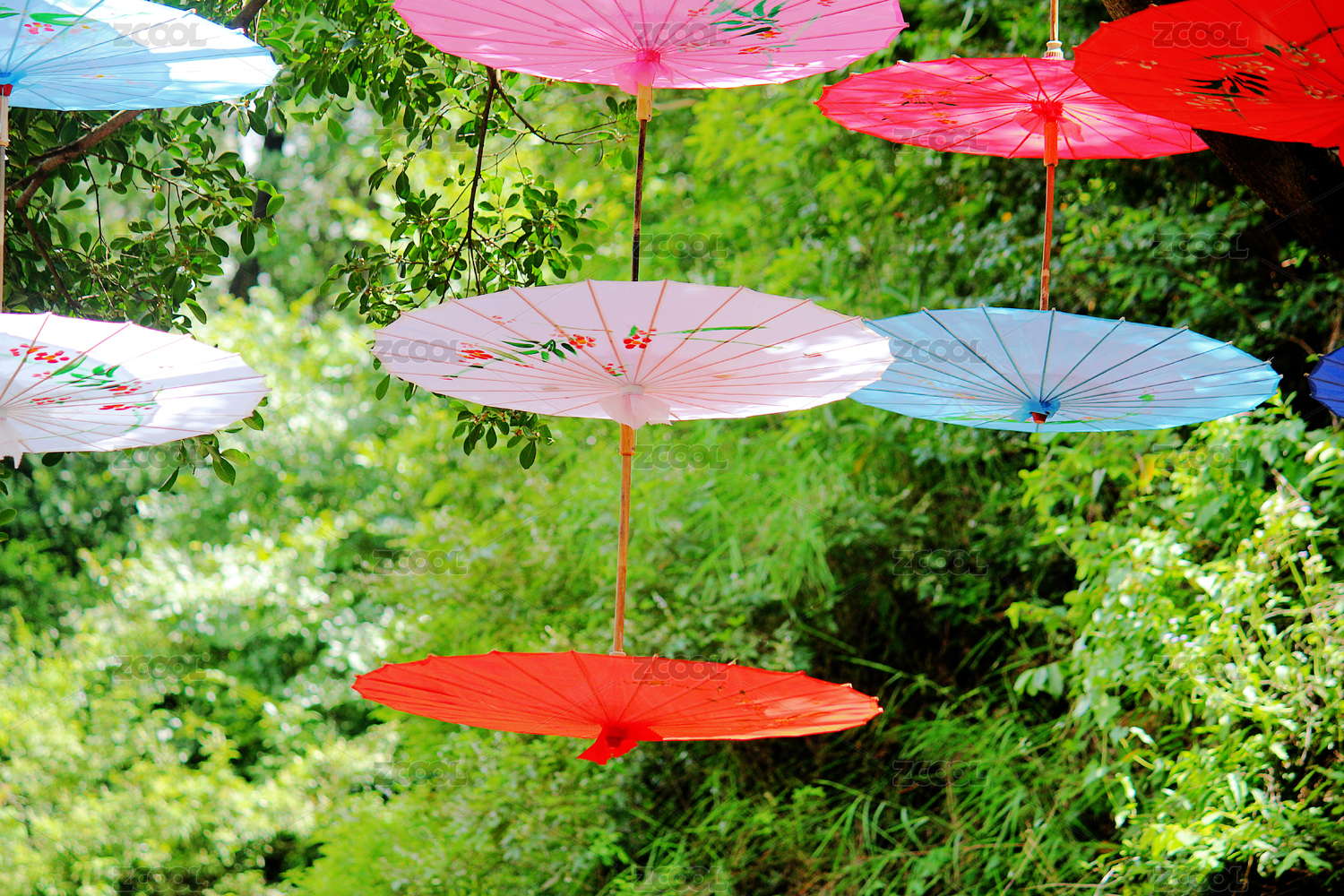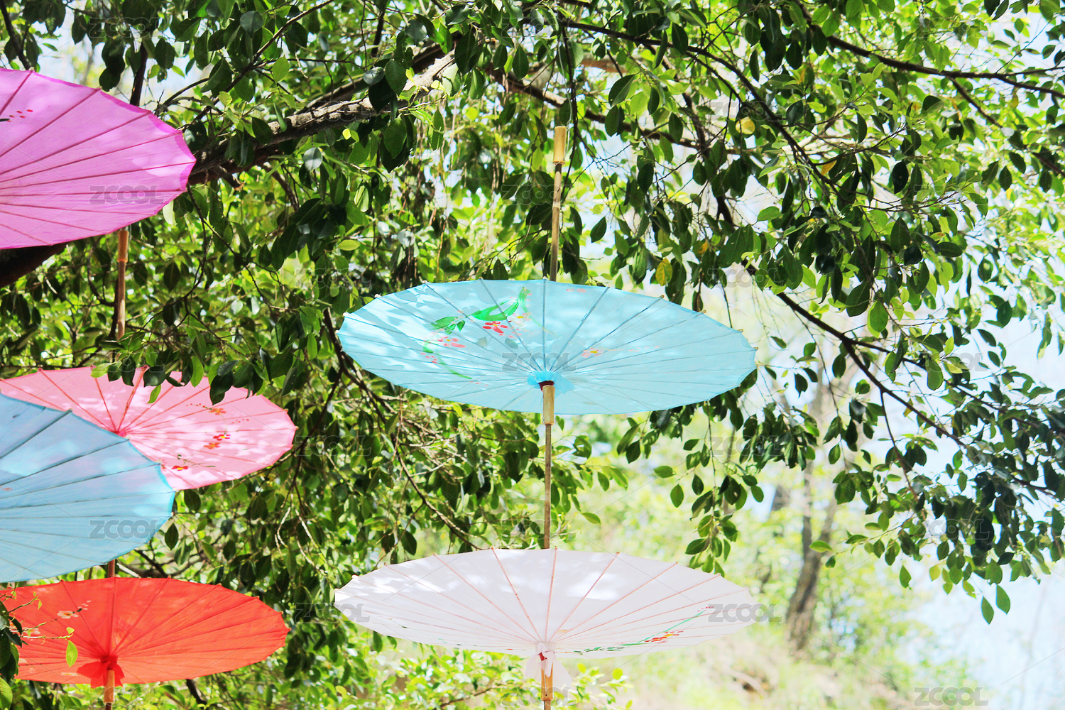 户外的天空中悬挂了多个彩色的艺术纸伞