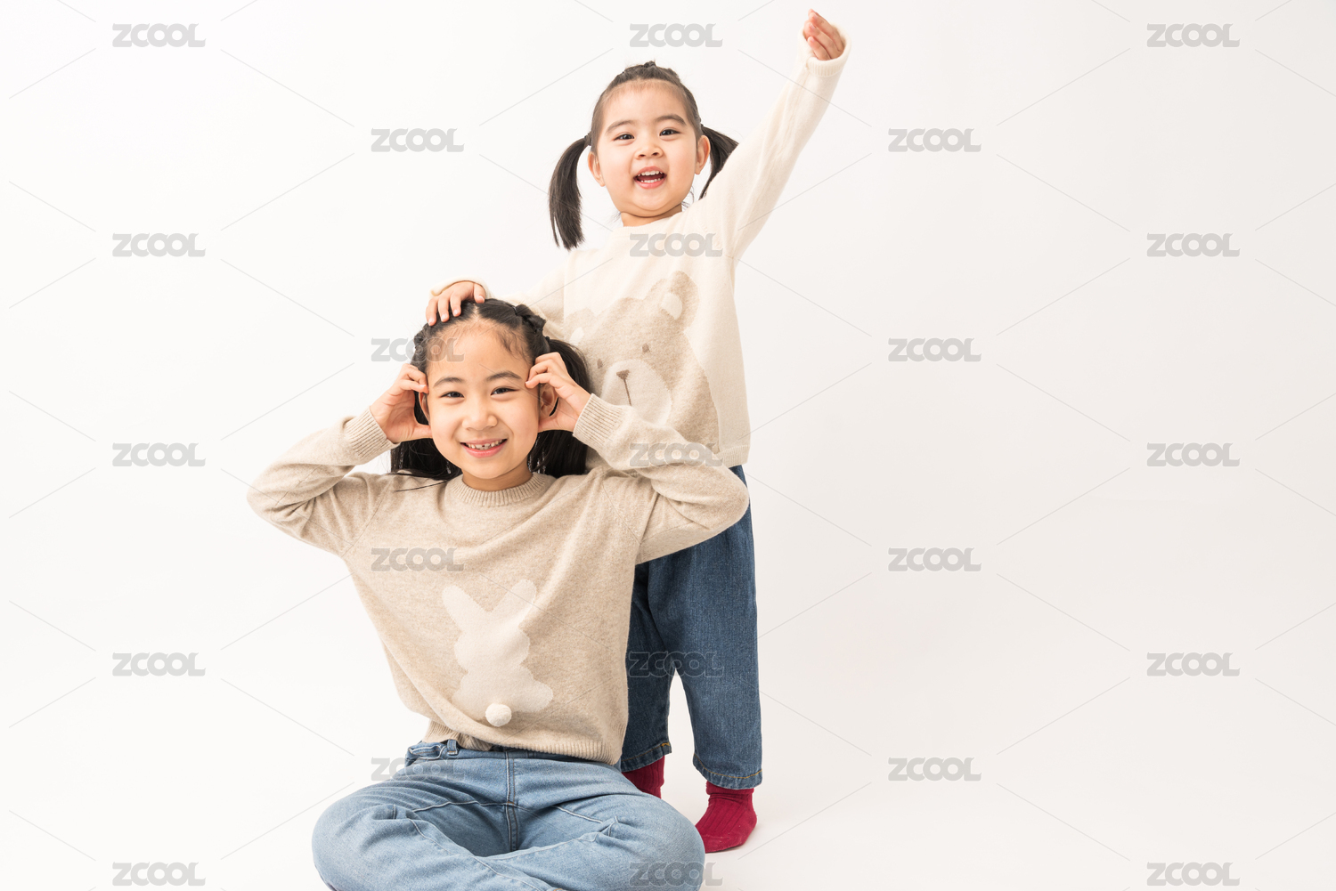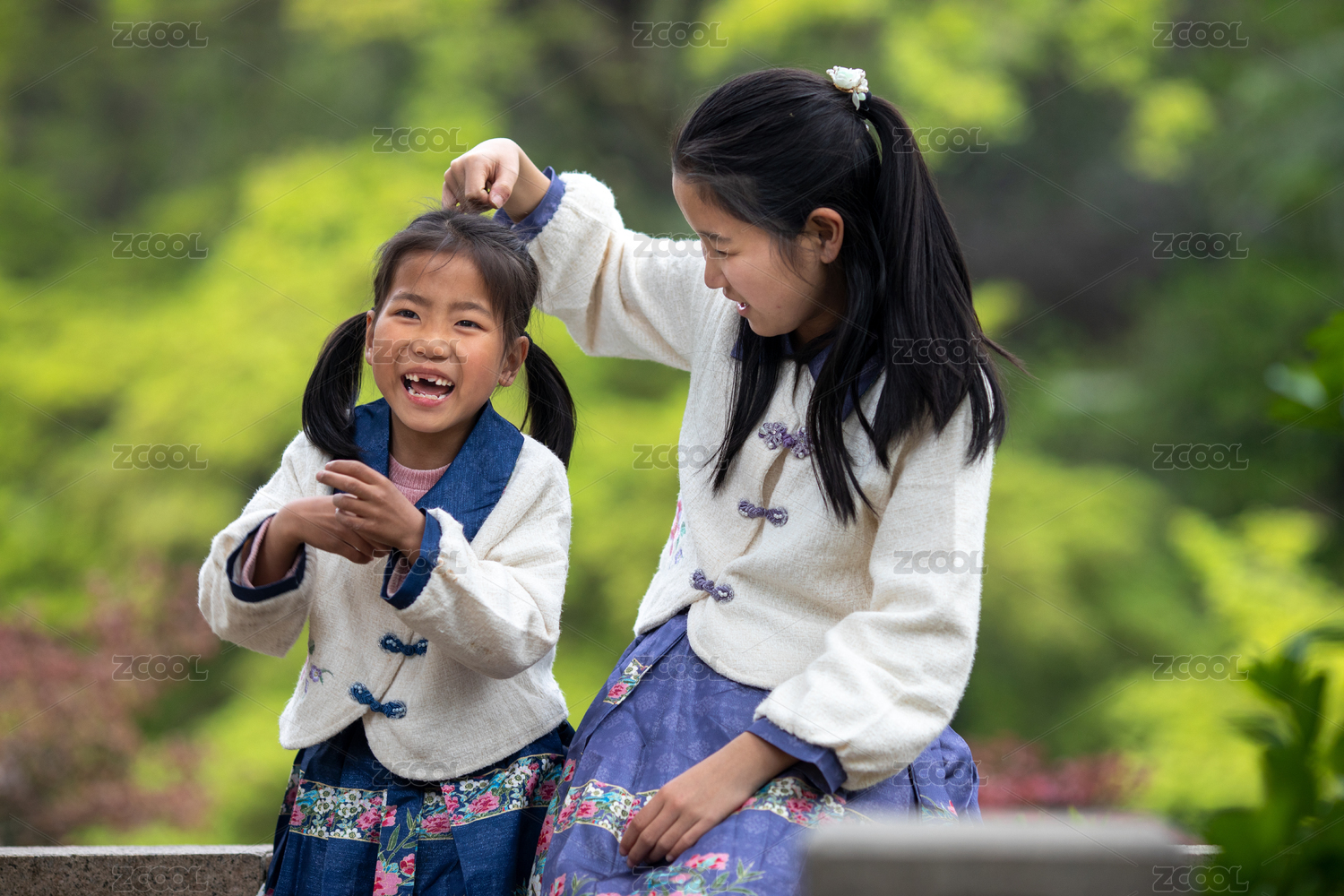 姐妹俩身着传统服饰微笑嬉戏,户外欢乐时光