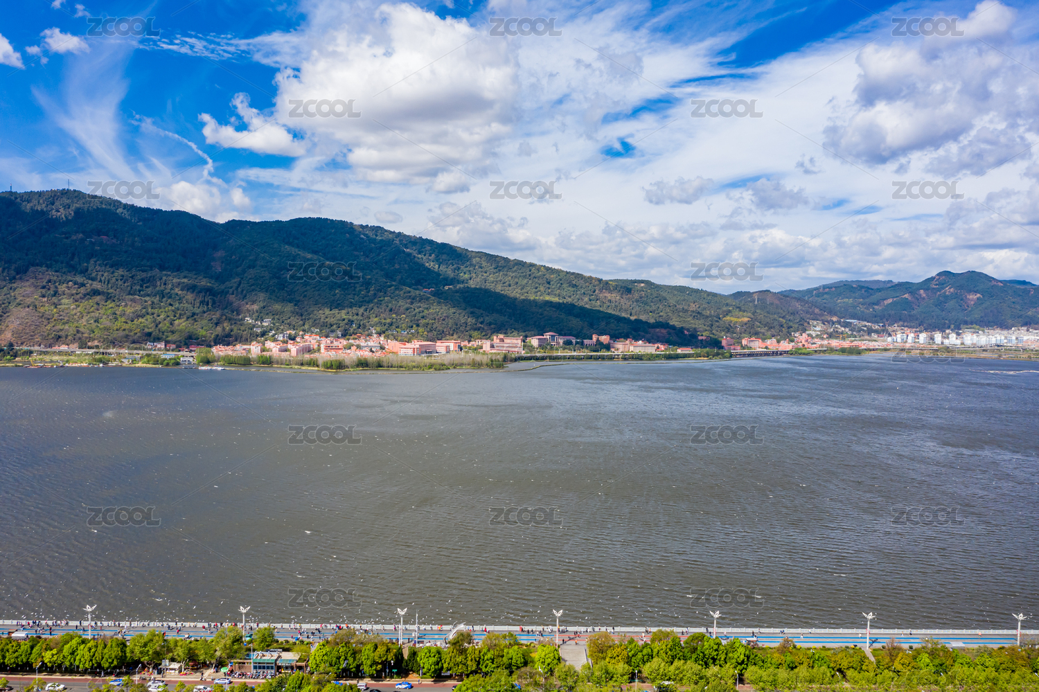 航拍云南昆明滇池海埂大坝滇池大坝亲水平台
