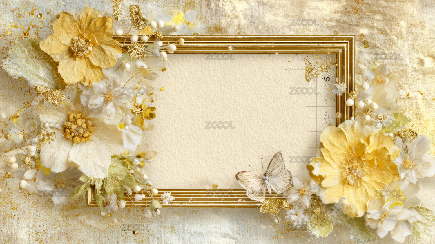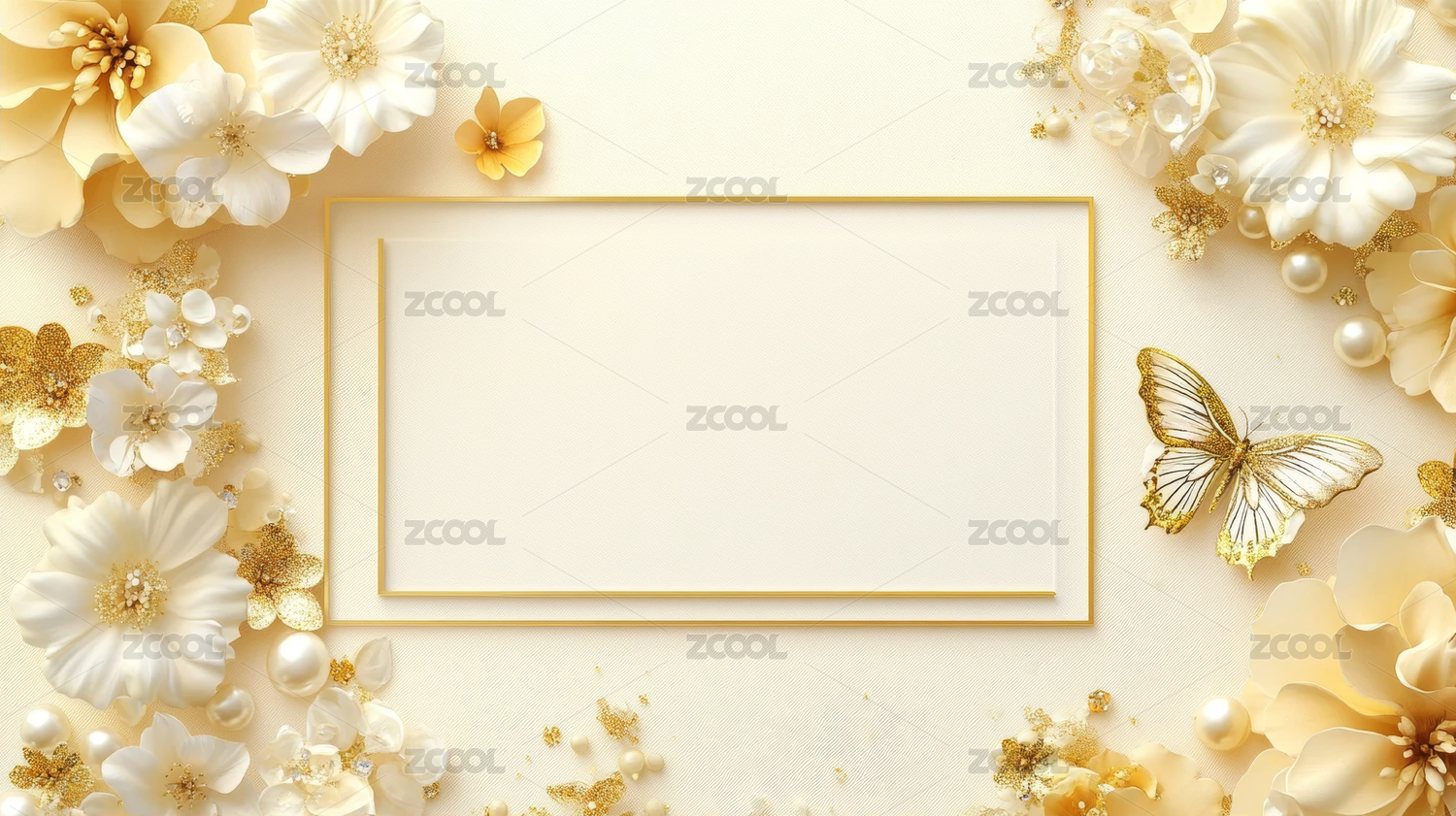 优雅奶油色花卉金框蝴蝶珍珠装饰背景