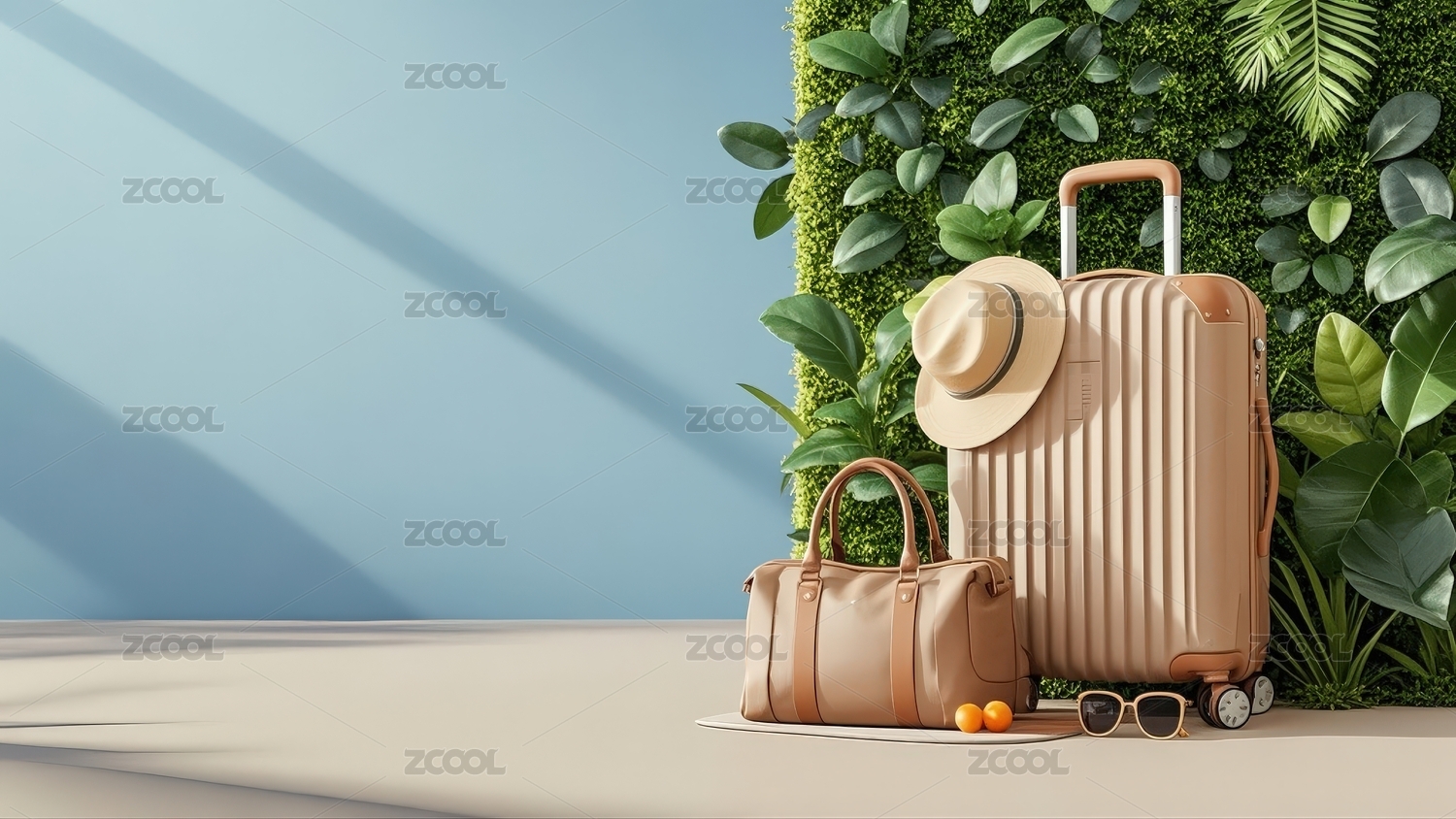 旅行箱包与绿植背景