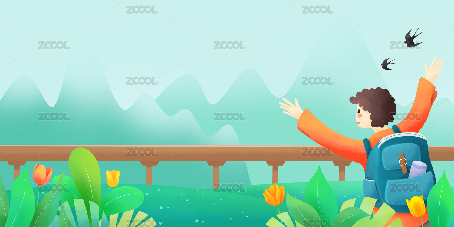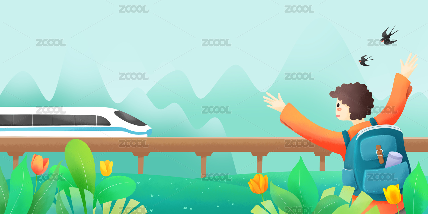 春天背着旅行包的孩子乘坐高铁游玩插画